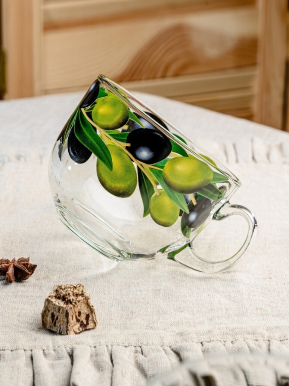 Объём — 450 мл, материал — прозрачное стекло, есть удобная ручка, модель «Оливки», бренд Декостек, страна продавца — Россия.