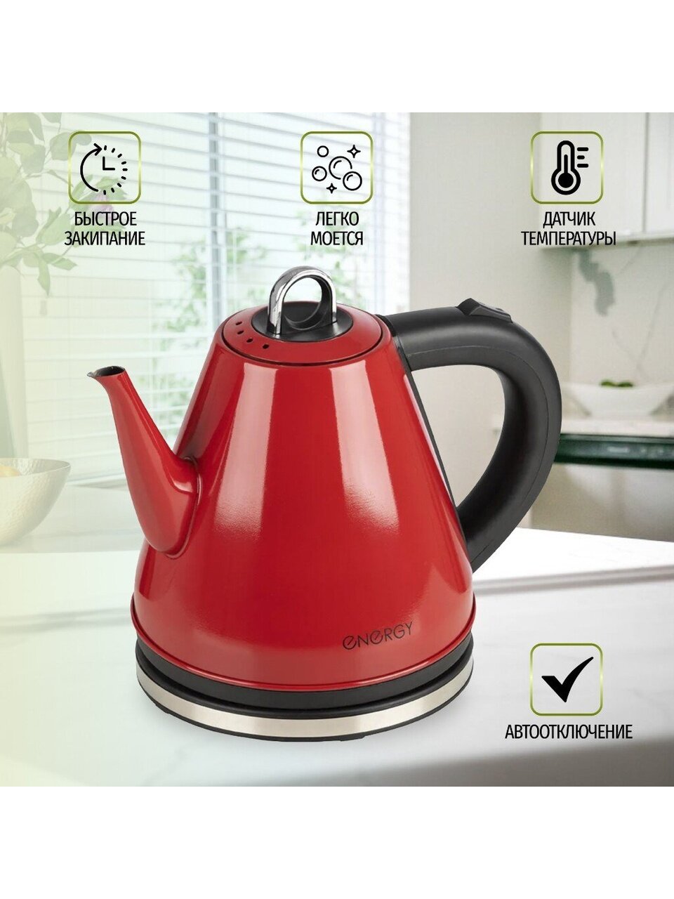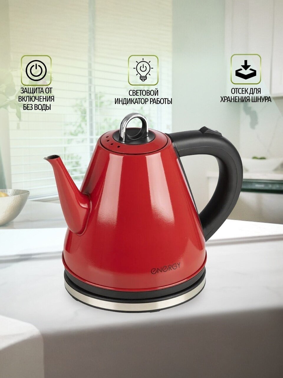 Электрочайник ENERGY E-263 привлекает внимание необычным дизайном корпуса, удобством, безопасностью и надежностью.