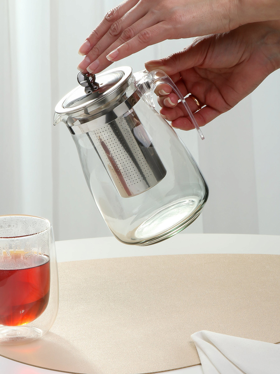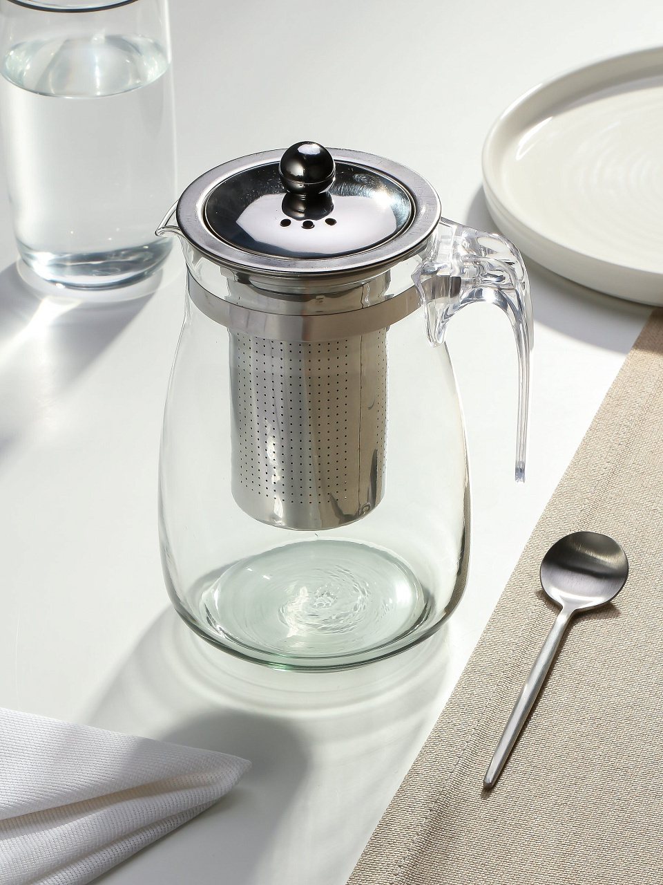 Заварочный чайник объемом 900 мл станет незаменимым элементом среди коллекции вашей посуды. Уникальная форма в виде стеклянного графина с носиком делает наливание очень удобным. Фильтр и крышка выполнены из нержавеющей стали. В крышке имеются отверстия для выхода пара.