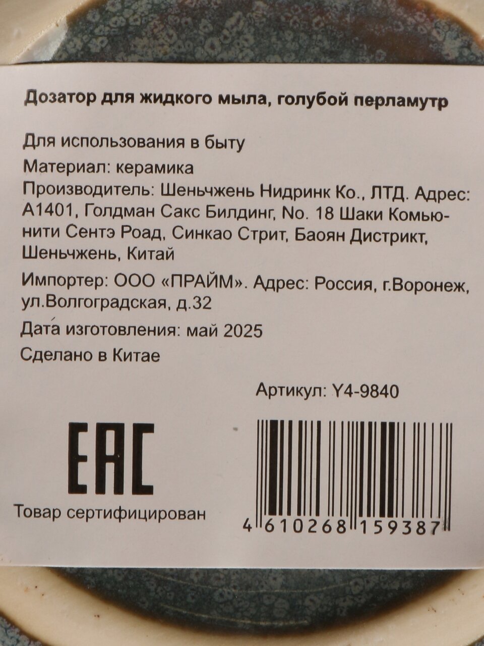 Дозатор для жидкого мыла из керамики с голубым перламутром Y4-9840 — стильное решение для ванной и кухни: экономия, гигиена, акцент в интерьере.