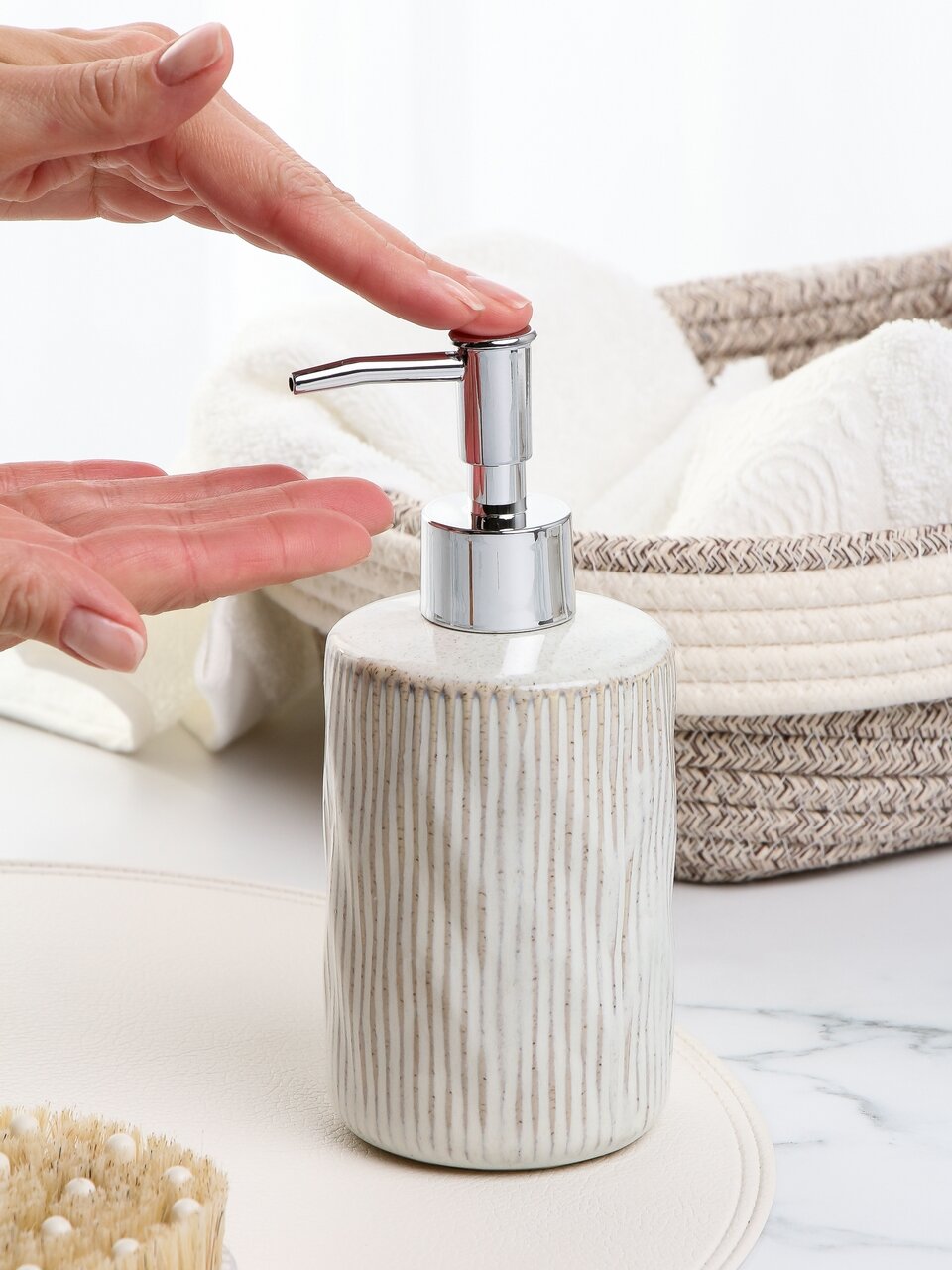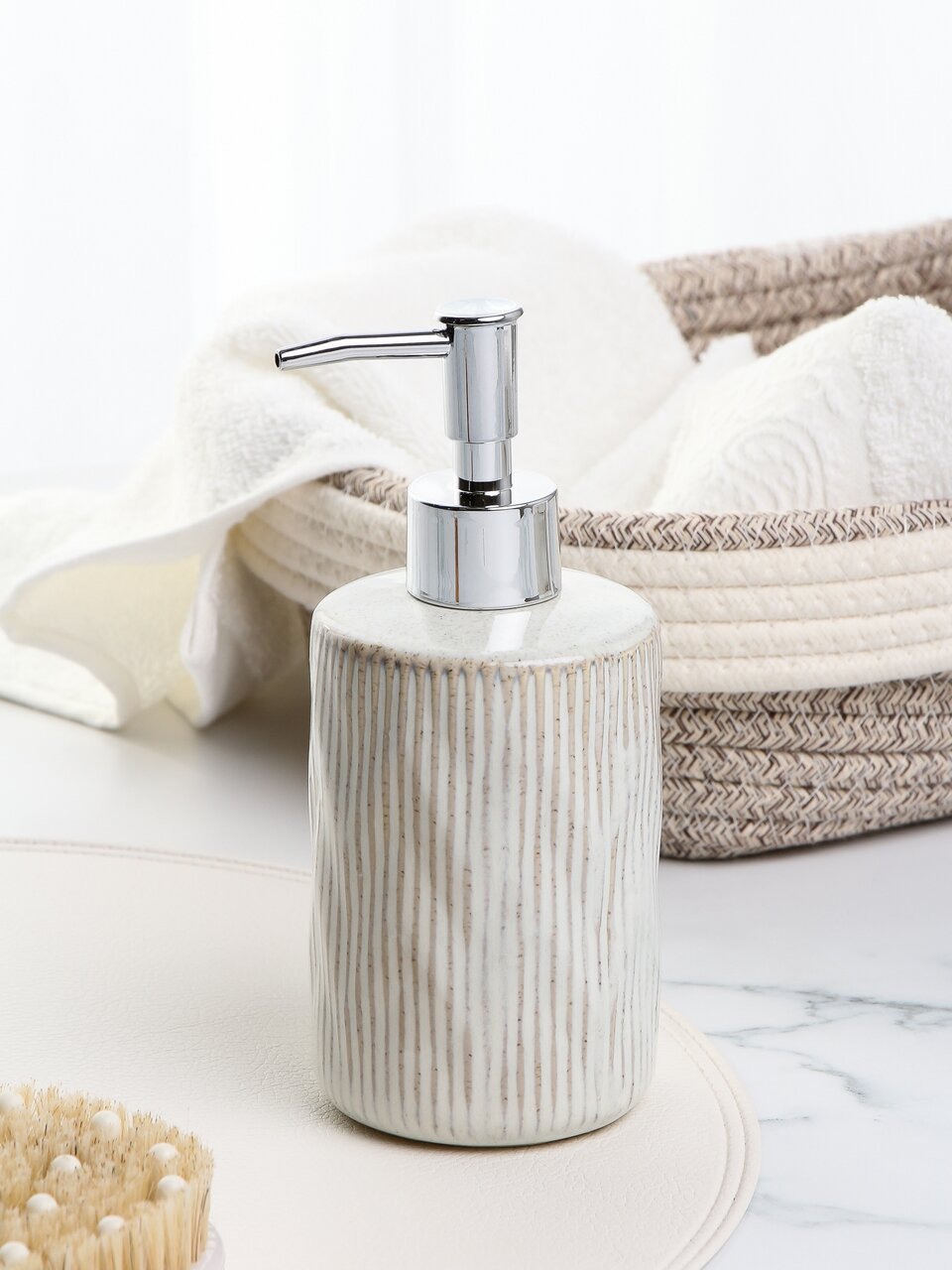 Дозатор для жидкого мыла из керамики коллекции «Бежевая полоса» — это практичный аксессуар, который легко вписывается в современный интерьер ванной комнаты или кухни. Керамическая основа устойчива к влаге и не впитывает запахи, а стильная бежевая полоса добавляет эстетики. Многие спрашивают: «Какой дозатор для жидкого мыла выбрать для частого использования?» — именно керамические модели отличаются долговечностью и простотой ухода.