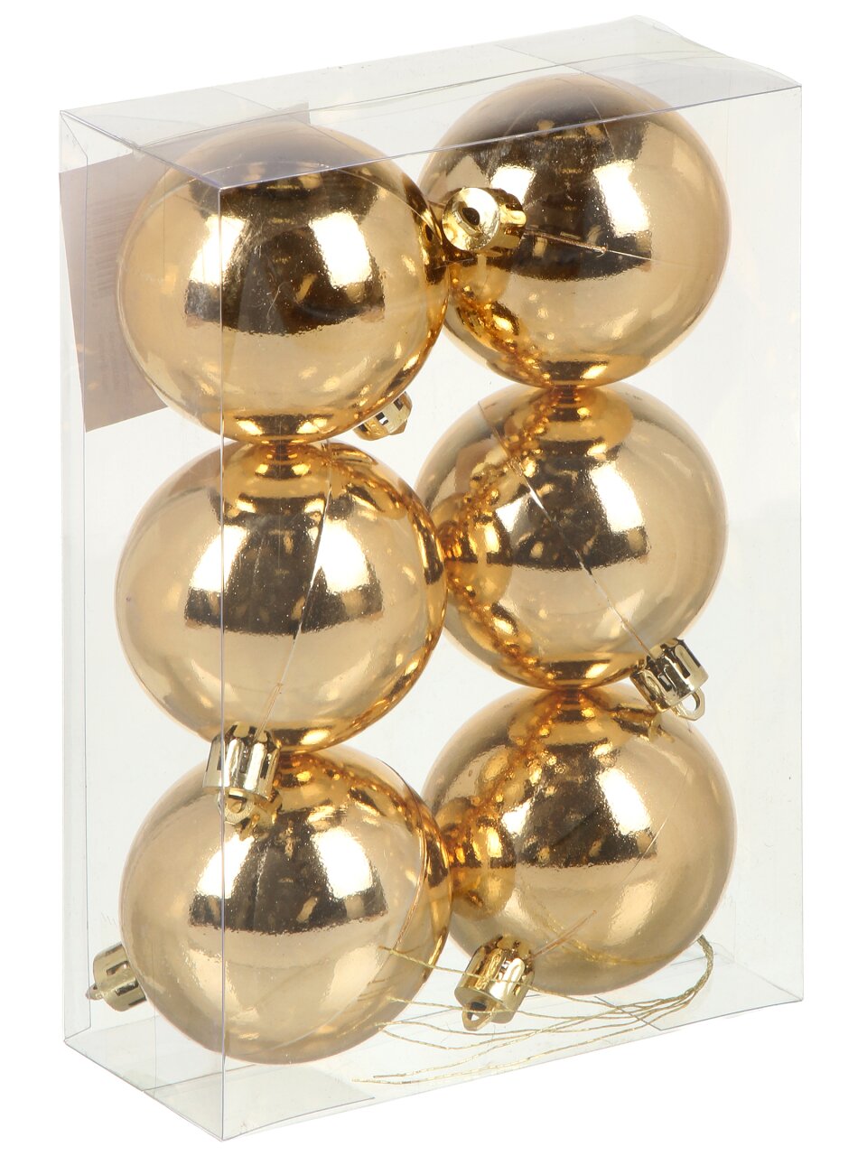 В наборе 6 елочных шаров, выполненных из прочного пластика с блестящим золотым покрытием. Каждый шар оснащён надежной подвеской для легкой фиксации на ветке.