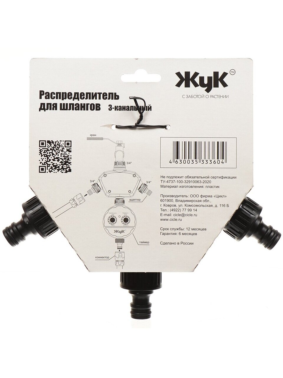 Распределитель для шланга трехканальный, вход 3/4", выход под коннектор, Жук, 3604-00, предлагает уникальные возможности для эффективного полива. Изготовленный из прочного пластика, он гарантирует долговечность и устойчивость к внешним воздействиям. Благодаря внутренней резьбе и возможности подключения коннектора, установка и использование распределителя не вызовут трудностей даже у начинающего садовода.