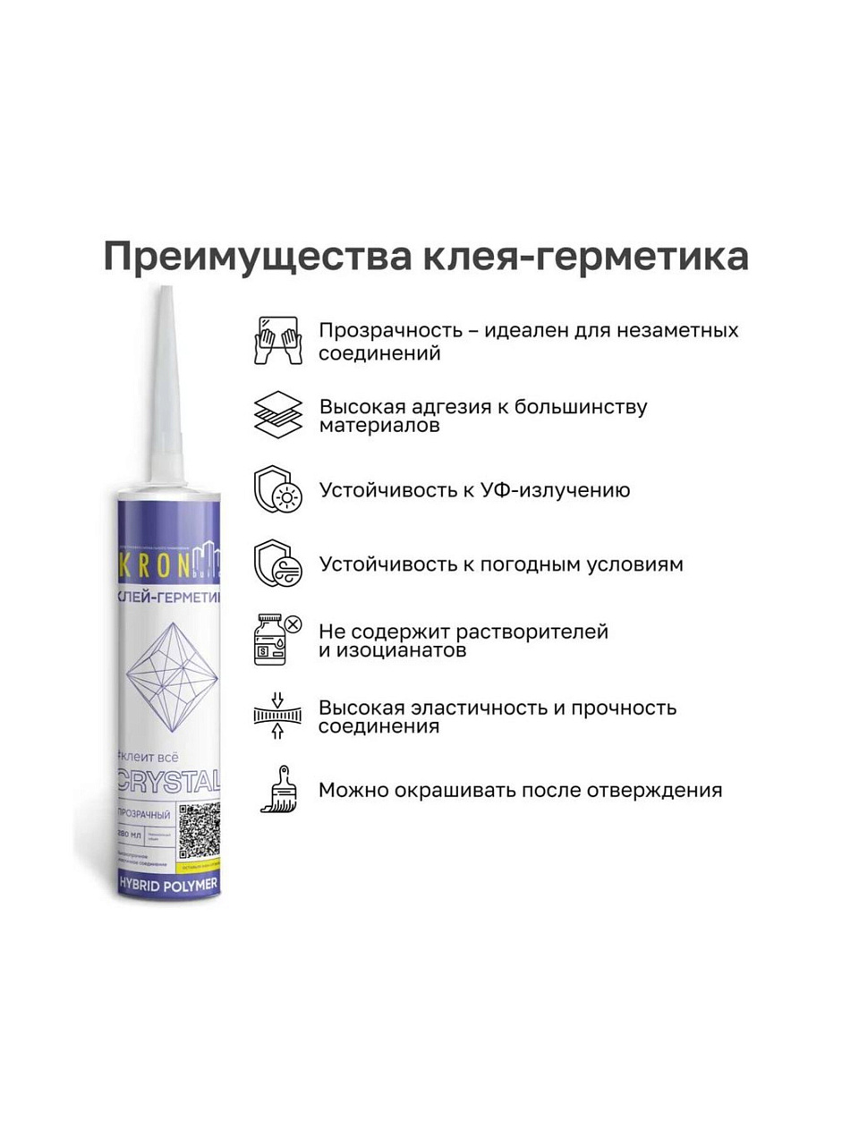 Клей-герметик Kronbuild Crystal 280 мл — это универсальный полимерный состав для герметизации и склеивания. Благодаря бесцветной формуле швы остаются незаметными, что особенно важно при ремонте стеклянных, керамических и пластиковых поверхностей. Этот герметик устойчив к влаге, химикатам и УФ-излучению, что делает его подходящим как для внутренних, так и для наружных работ. Если вы ищете, какой герметик выбрать для ванной, кухни или фасада, обратите внимание на эластичность и возможность окрашивания этого состава.