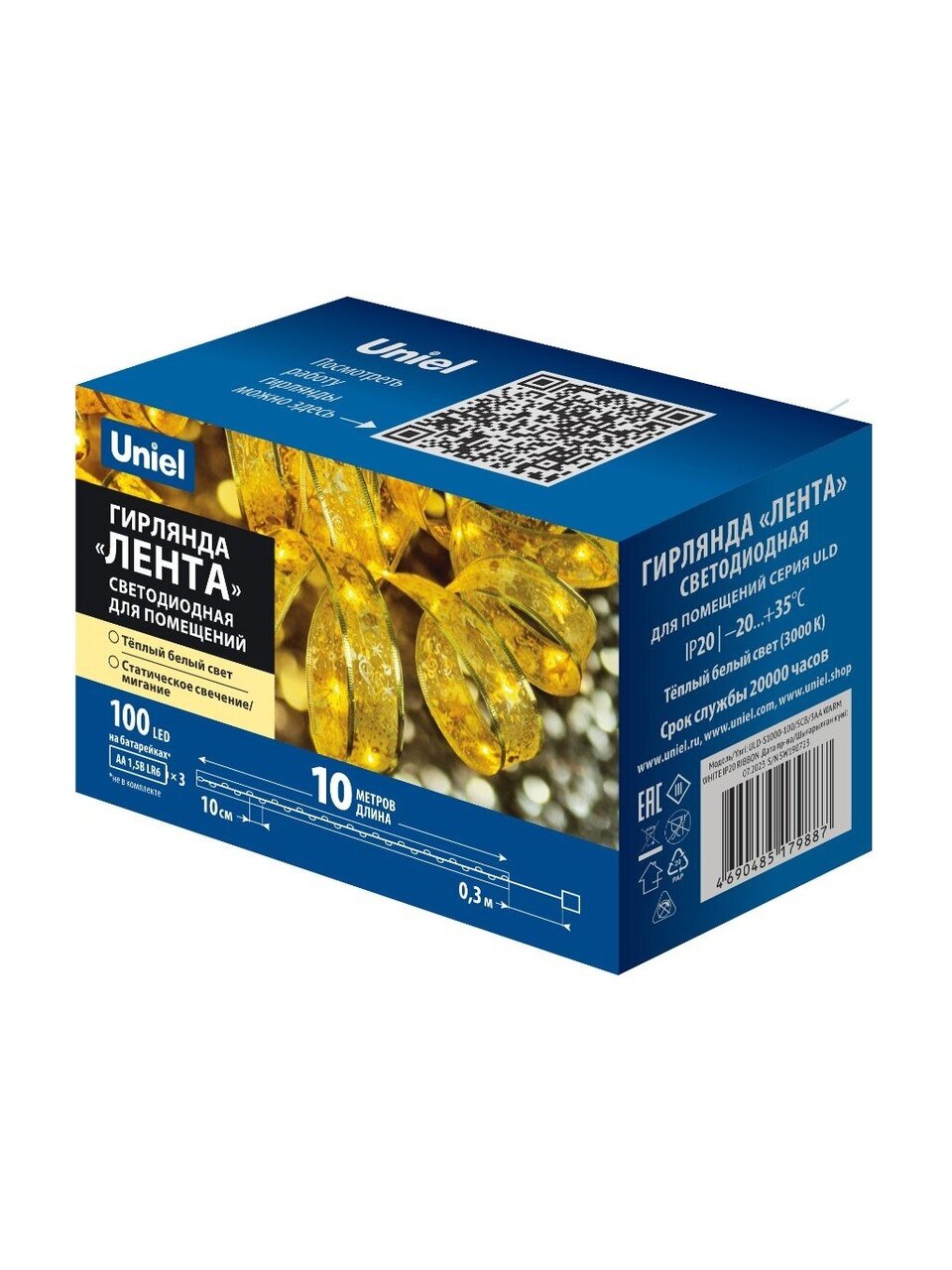 Вы можете приобрести «Гирлянда светодиодная 100 ламп, 10 м, Лента, Uniel, теплый белый свет, на батарейках, 3 АА, не в комплекте, UL-00010900» и другие товары в нашем интернет-магазине в Казани по низким ценам и с бесплатным самовывозом.