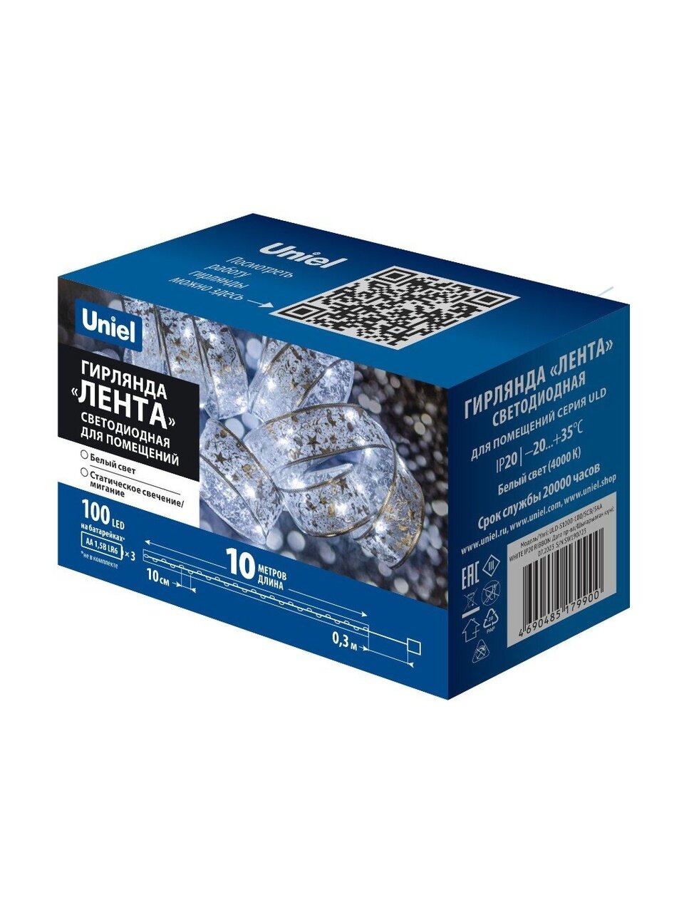 Вы можете приобрести «Гирлянда светодиодная 100 ламп, 10 м, Лента, Uniel, свет белый, на батарейках, 3 АА, не в комплекте, UL-00010901» и другие товары в нашем интернет-магазине в Обнинске по низким ценам и с бесплатным самовывозом.