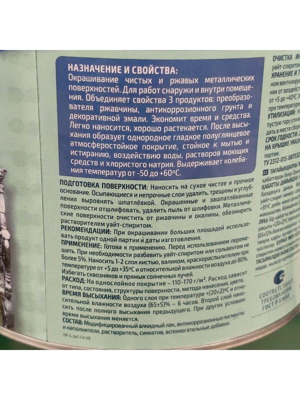 Окрашивание чистых и ржавых металлических поверхностей. Для работ снаружи и внутри помещения. Объединяет свойства 3 продуктов: преобразователя ржавчины, антикоррозионного грунта и декоративной эмали.