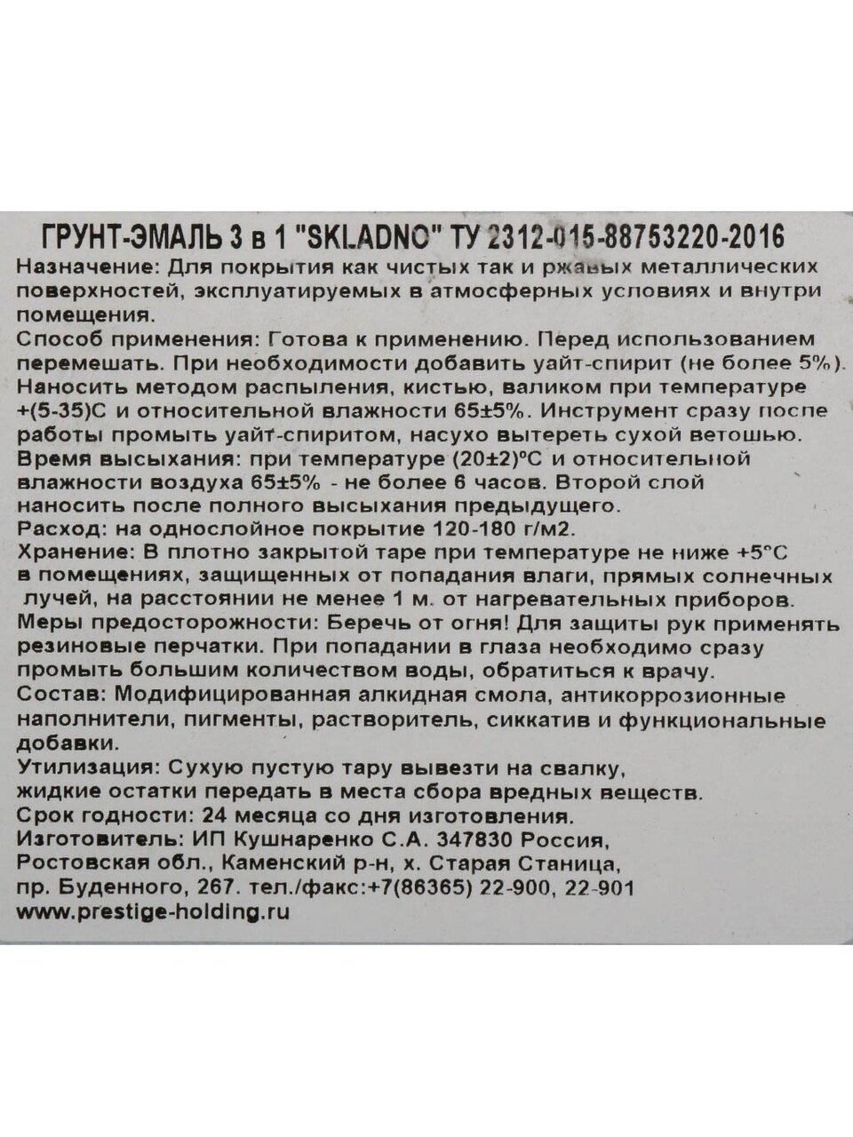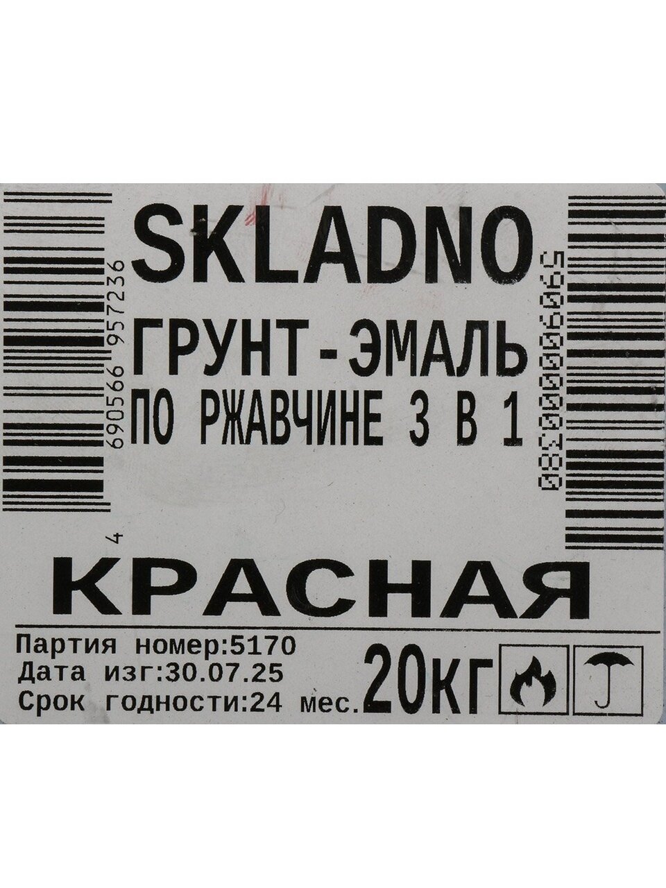 Грунт-эмаль Skladno по ржавчине: защита и яркий цвет для металла, 3в1, алкидная основа, 20 кг — долговечность и экономия для больших площадей.