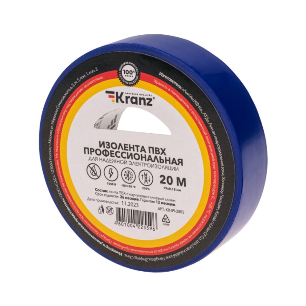 Профессиональная изолента ПВХ Kranz — надежный помощник для электромонтажных работ. Ширина 19 мм и плотность 180 мкм обеспечивают надежную изоляцию проводов. Синий цвет делает ее заметной и стильной. Длина 20 метров позволяет использовать ее для различных задач.