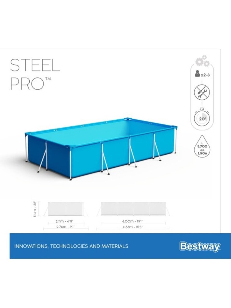 Каркасный бассейн Bestway, размером 400х211х81 см, идеально подходит для семейного использования благодаря своей вместительности и прочности. Изготовленный из высококачественного трехслойного ПВХ, он гарантирует долговечность и надежность. Стальной каркас обеспечивает дополнительную устойчивость и безопасность, что особенно важно для активного отдыха с детьми. Объем 5700 литров позволяет наслаждаться водными процедурами всей семьей.