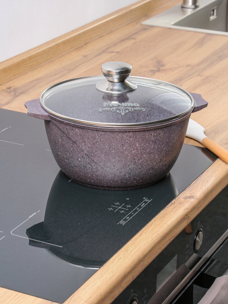 Кастрюля изготовлена из литого алюминия и подходит для всех типов плит, кроме индукционных. Для индукции требуется специальное ферромагнитное дно.