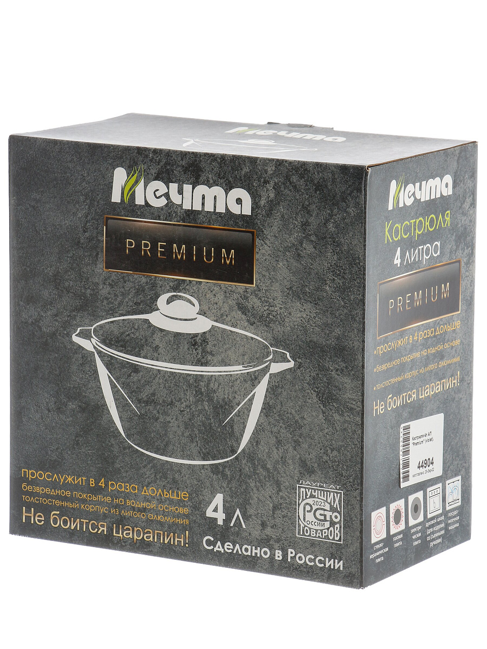 Объём — 4 литра. Кастрюля оптимальна для приготовления первых и вторых блюд на 3-5 человек, крышка выполнена из прочного стекла для контроля процесса.