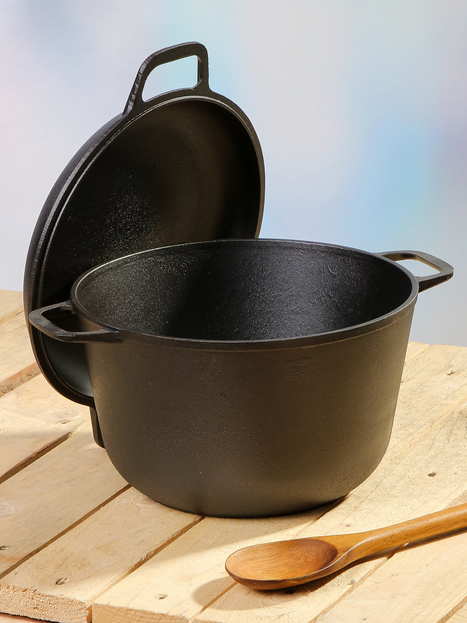- Мощный чугун 3,8 мм дно, объём 6 л, диаметр 26 см — равномерный нагрев, подходит для больших семей и праздников