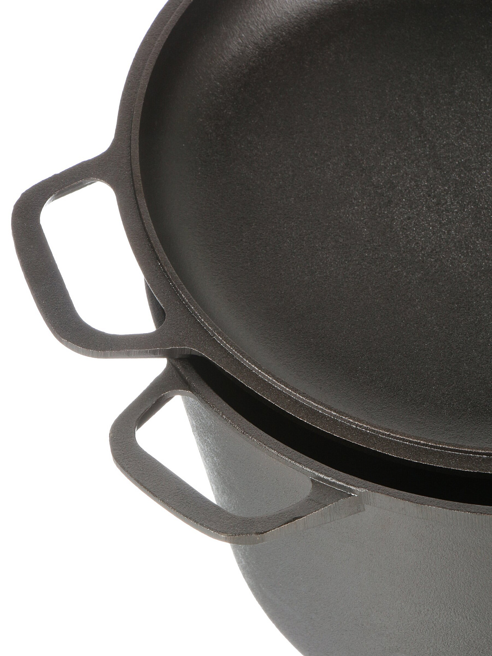 Крышка выполнена из чугуна и служит полноценной сковородой. Для долговечности рекомендуется мыть вручную и периодически прокаливать с маслом для создания защитного слоя.