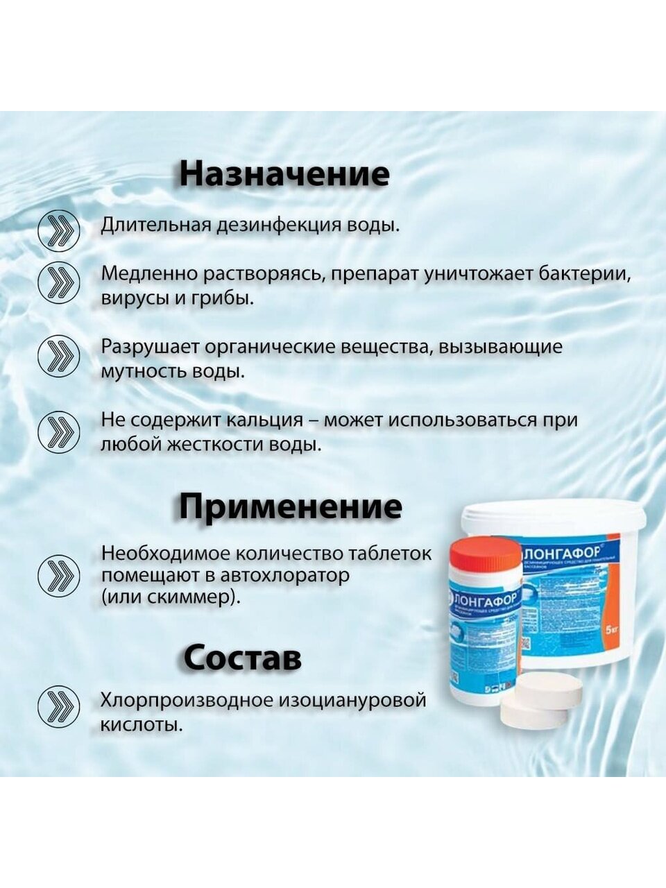 Представляем средство для дезинфекции воды Маркопул Кемиклс Лонгафор — идеальное решение для поддержания чистоты и безопасности воды в вашем бассейне. Эти медленнорастворимые таблетки обеспечивают эффективную дезинфекцию, уничтожая бактерии, вирусы и грибы, и способствуют осветлению воды. Это химия для воды бассейна, которая не содержит кальция, что позволяет использовать средство при любой жесткости воды. Выбирайте надежную химию для бассейна и обеспечьте себе и своим близким кристально чистую воду без лишних хлопот.