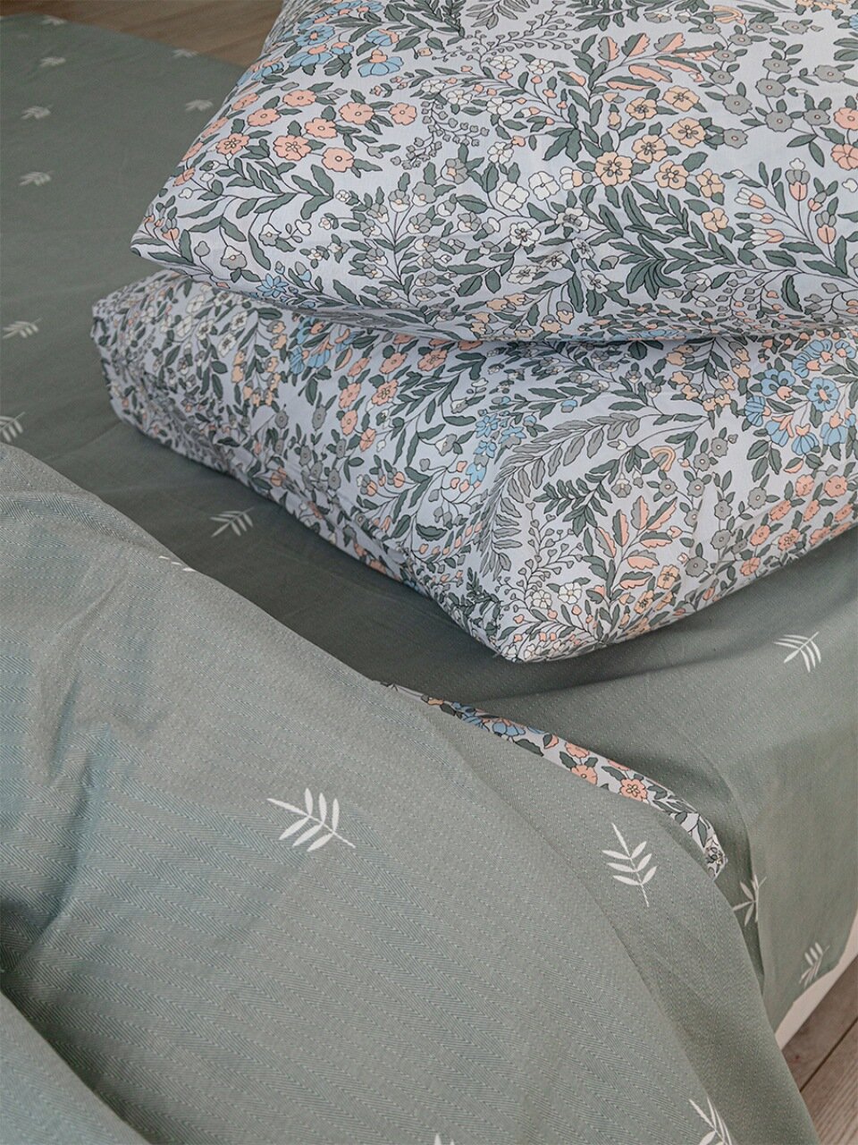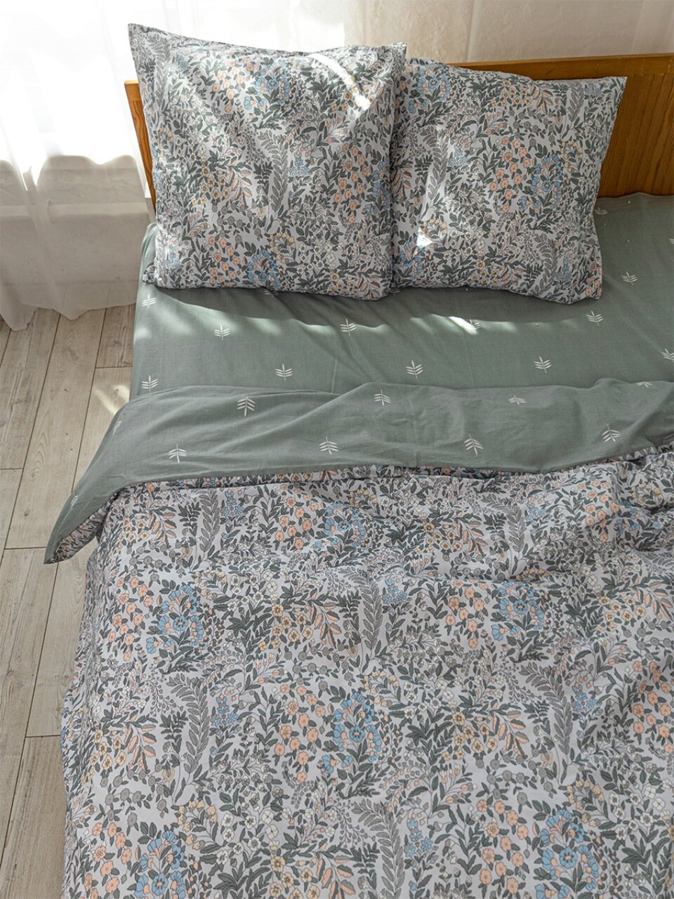 Постельное белье выполнено из 100% хлопковой бязи. Рекомендуется машинная стирка при 40°C — ткань сохраняет форму и цвет, не требует сложного ухода.
