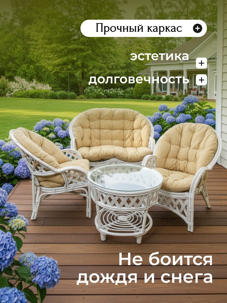 Вы можете приобрести «Мебель садовая Ялта, светлая, стол, 70.5х70.5х56.5 см, 2 кресла, 1 диван, подушка бежевая, 120 кг, 132.5х84.6х91.5 см, IND05» и другие товары в нашем интернет-магазине в Клинцах по низким ценам и с бесплатным самовывозом.