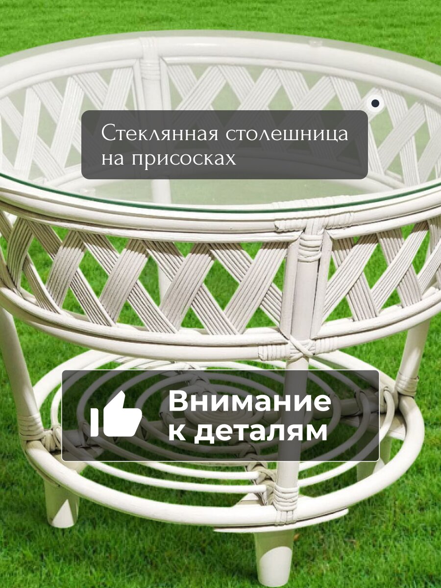 Плетеная мебель — это неповторимый стиль и уютная атмосфера, создающая умиротворенность и расслабленность. Лоза ротанга чарует своей невероятной теплотой и декоративностью. Легкое ажурное переплетение ротанга и прозрачная стеклянная столешница придают мебели невесомый, воздушный вид.