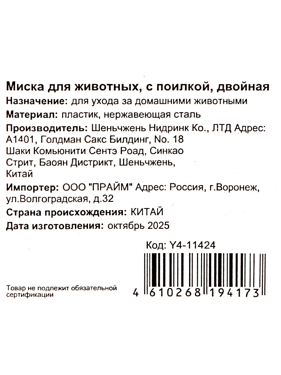 Какие размеры и материал у миски Y4-11424?