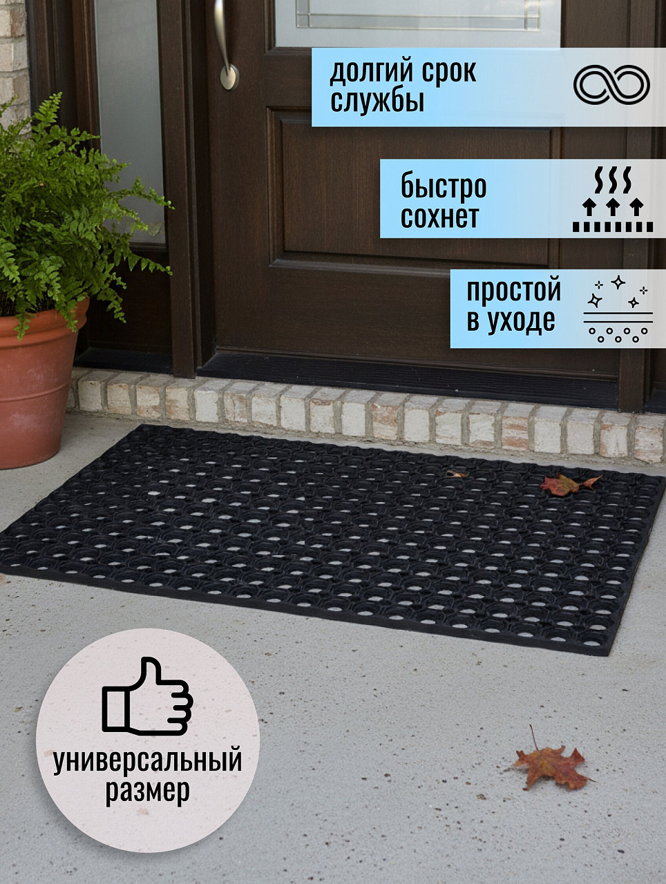 Грязезащитный коврик является 1-ой степенью защиты от уличной грязи. Может быть расположен на улице перед входом в здание, очищая обувь от крупных частиц снега, грязи.