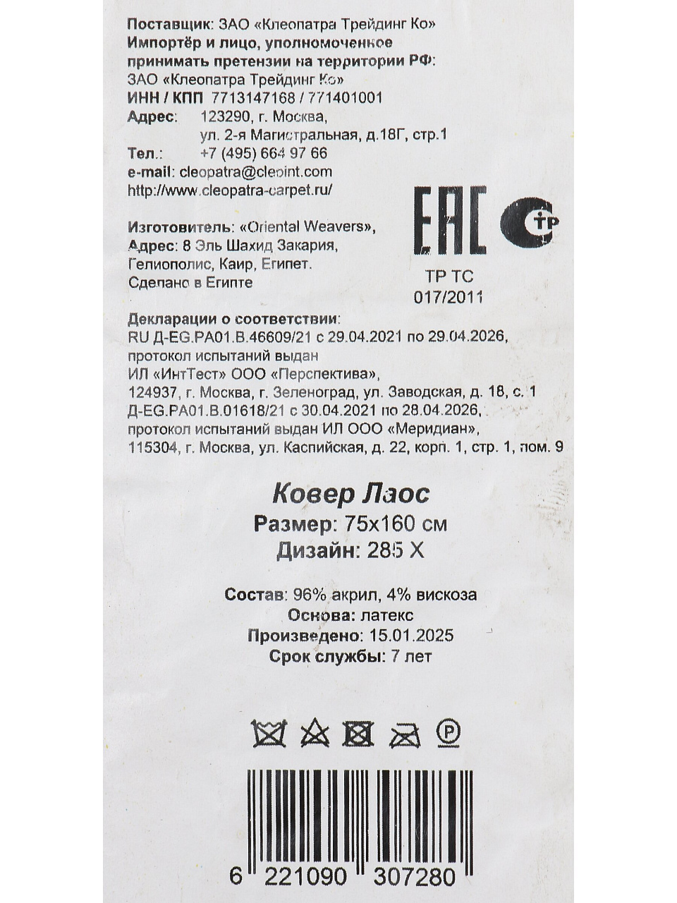Ковер изготовлен из прочных материалов, рассчитан на ежедневное использование и сохраняет внешний вид при правильном уходе.