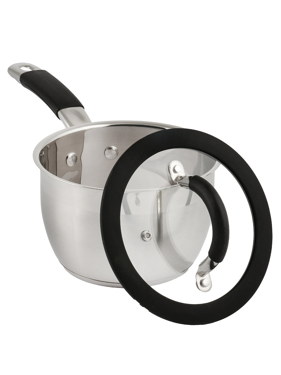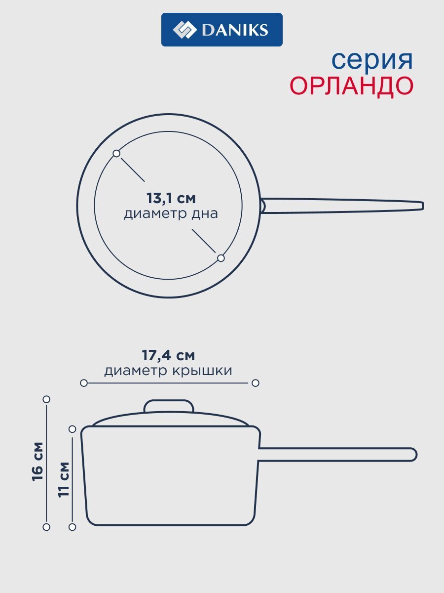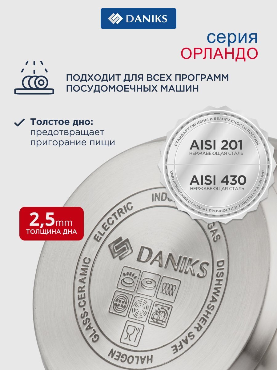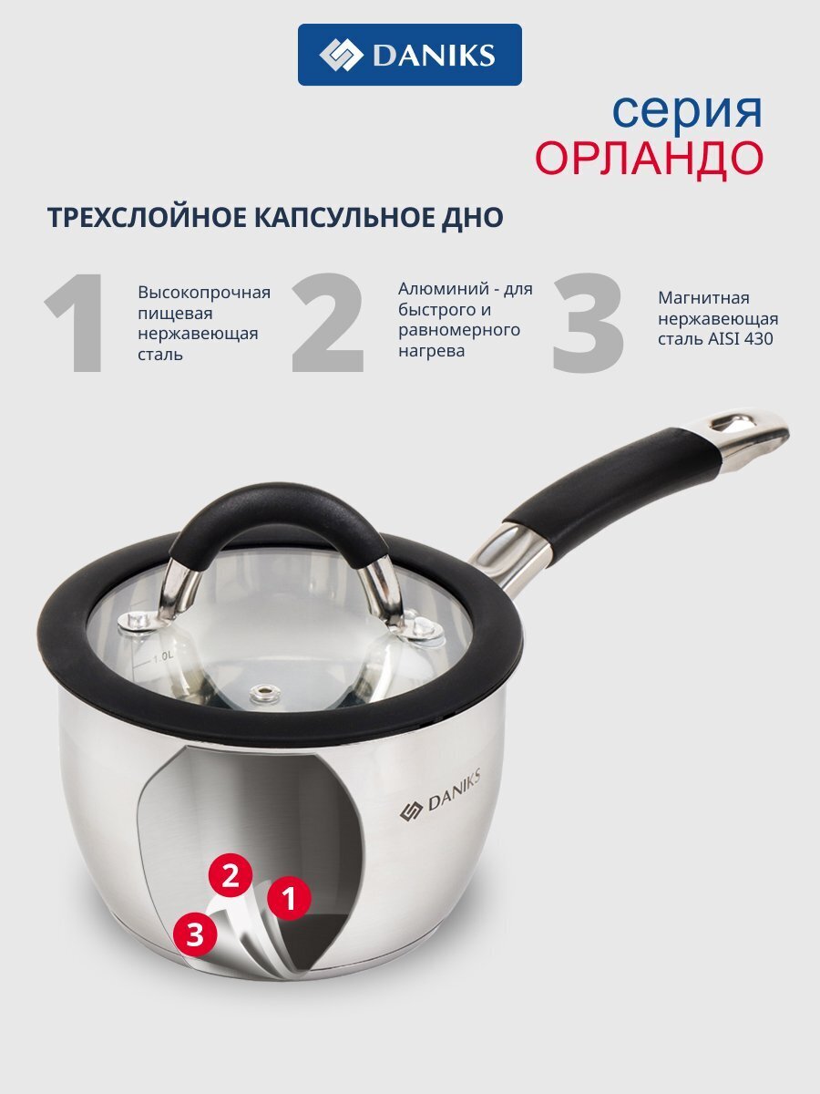 Ковш Daniks Орландо 1.9 л: стальная надежность, стеклянная крышка и силиконовая ручка для безопасной готовки на всех типах плит — идеален для дома и дачи.