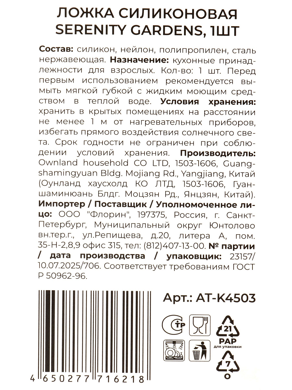 Да, силиконовая ложка Atmosphere Serenity Gardens (артикул AT-K4503) подходит для мытья в посудомоечной машине, не теряя форму и цвет.