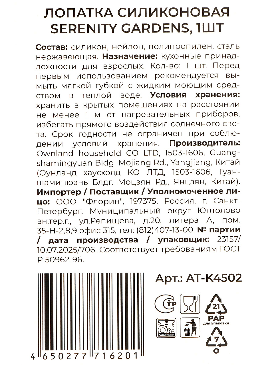 Лопатка кулинарная из силикона 38 см Atmosphere Serenity Gardens: не царапает посуду, выдерживает высокие температуры, идеальна для выпечки и блинов