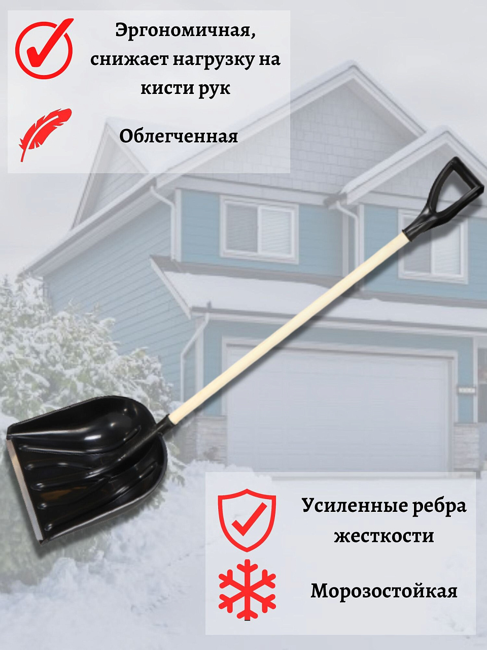 Лопата для снега пластик 410х460 мм с деревянным черенком и V-ручкой — быстрое решение для уборки снега на даче и возле дома, прочная и удобная для любого возраста.