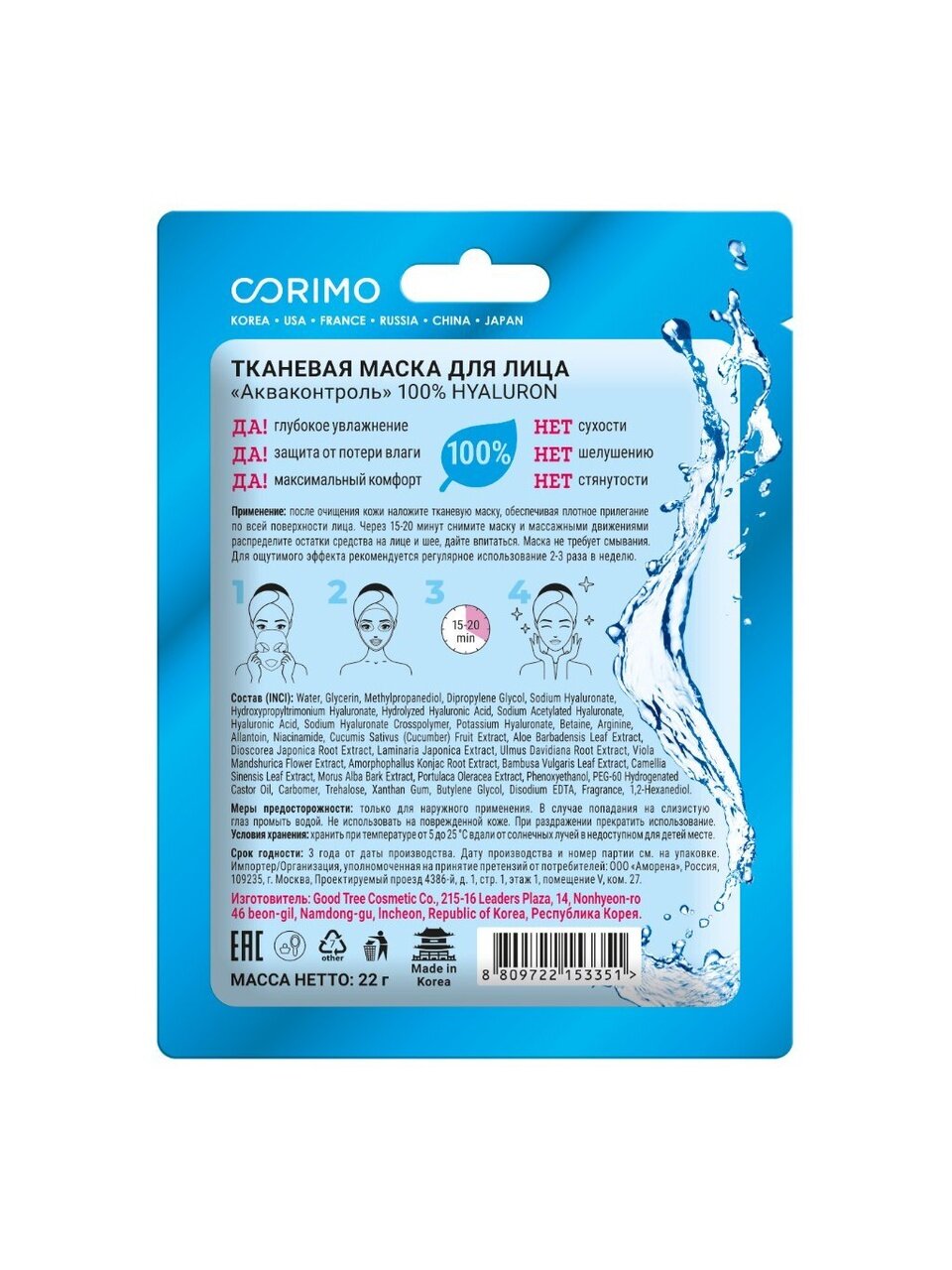 Вы можете приобрести «Маска для лица, Corimo, Акваконтроль, тканевая, 22 г, 100% Hyaluron» и другие товары в нашем интернет-магазине в Таганроге по низким ценам и с бесплатным самовывозом.