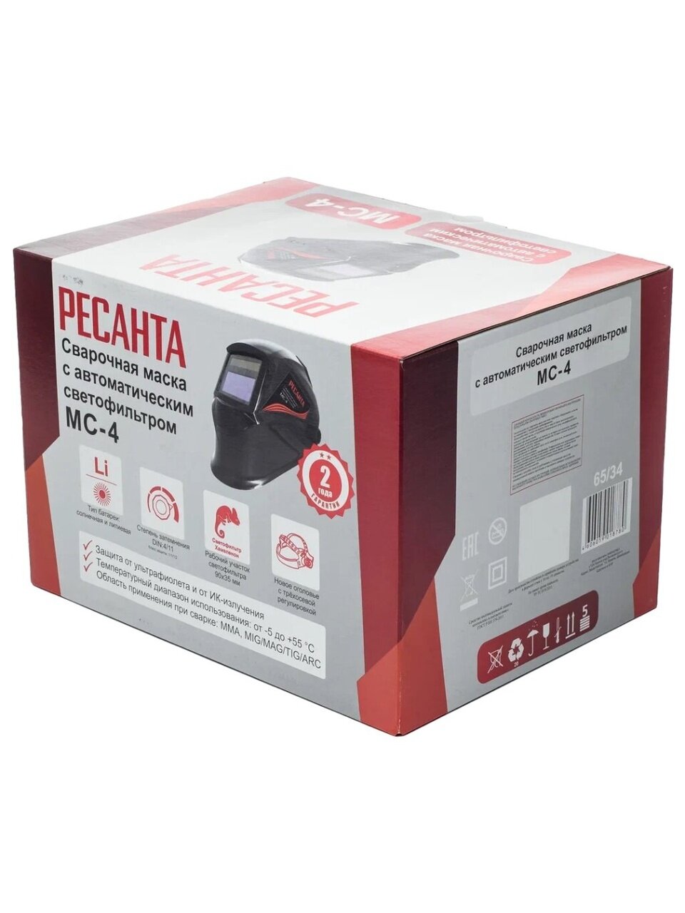 Сварочная маска Ресанта МС-4 65/34 защищает лицо и глаза от ярких вспышек, искр, брызг расплавленного металла во время проведения сварочных работ. Автоматическое затемнение маски происходит через 0,1 мс при возникновении сварочной дуги и быстро восстанавливается в исходное состояние при её отсутствии. Это позволяет не отвлекаться от рабочего процесса. Маска питается от солнечной батареи и легкозаменяемой батареи.