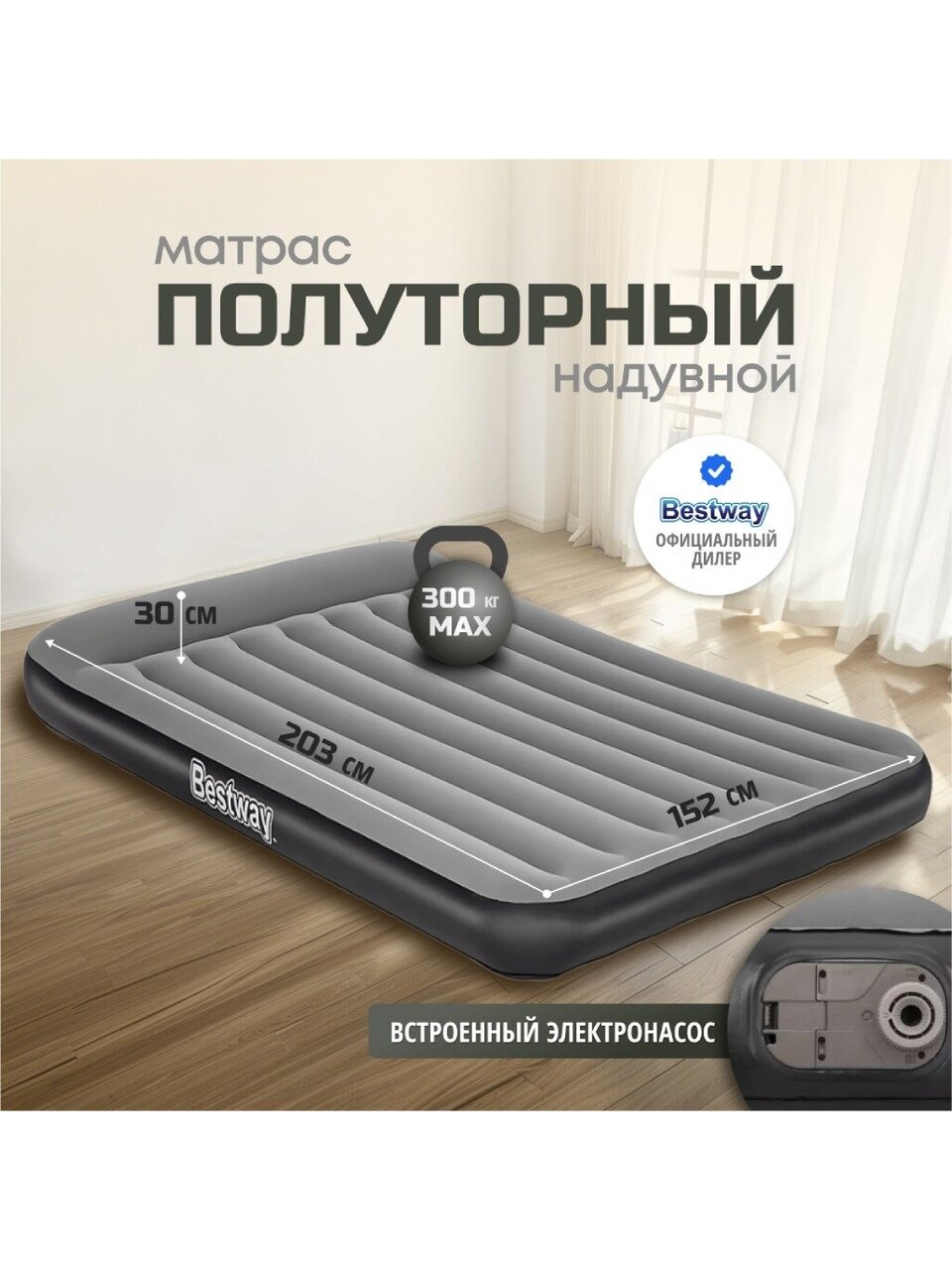Вы можете приобрести «Матрас надувной Bestway, 203х152х30 см, 67464, насос встроенный, электрический, флокированный, 300 кг» и другие товары в нашем интернет-магазине в Тамбове по низким ценам и с бесплатным самовывозом.