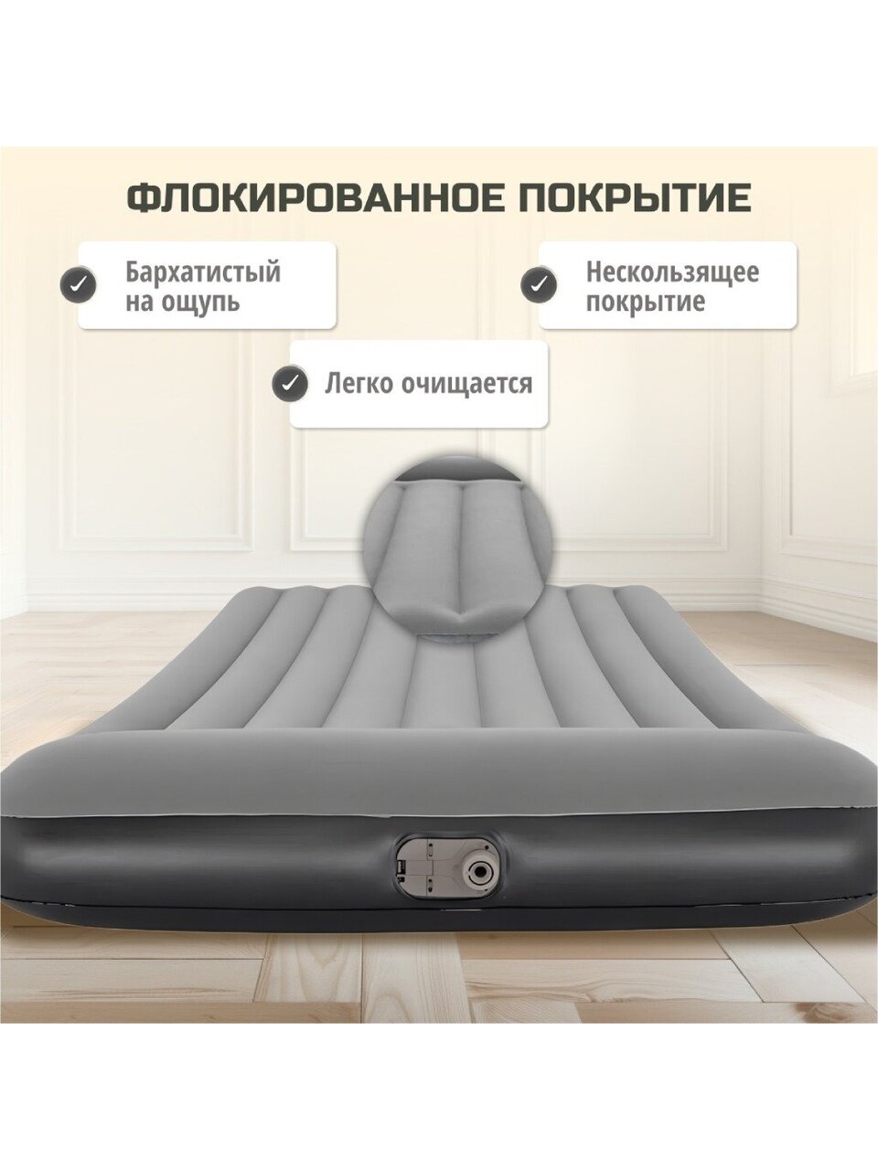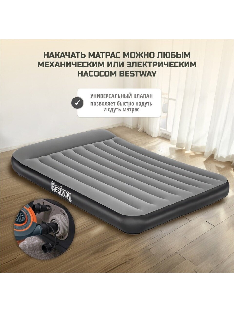Надувной матрас Bestway обеспечивает комфортный и здоровый сон в любой ситуации. Изготовленный из прочного флокированного винила, он имеет особую конструкцию, которая сохраняет свою форму даже при неравномерной нагрузке.