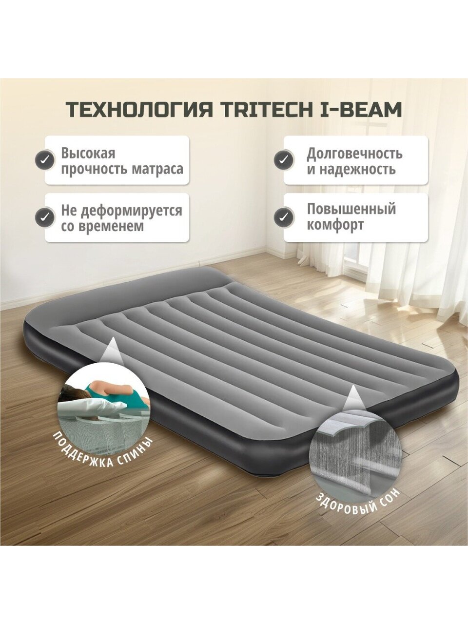 Вместо обычных перегородок из ПВХ, компания Bestway применяет большое количество прочных волокон, что предотвращает их растяжение и деформацию при использовании. Это позволяет матрасу сохранять свою форму, не проминаясь и не продавливаясь, обеспечивая комфортный и здоровый сон.