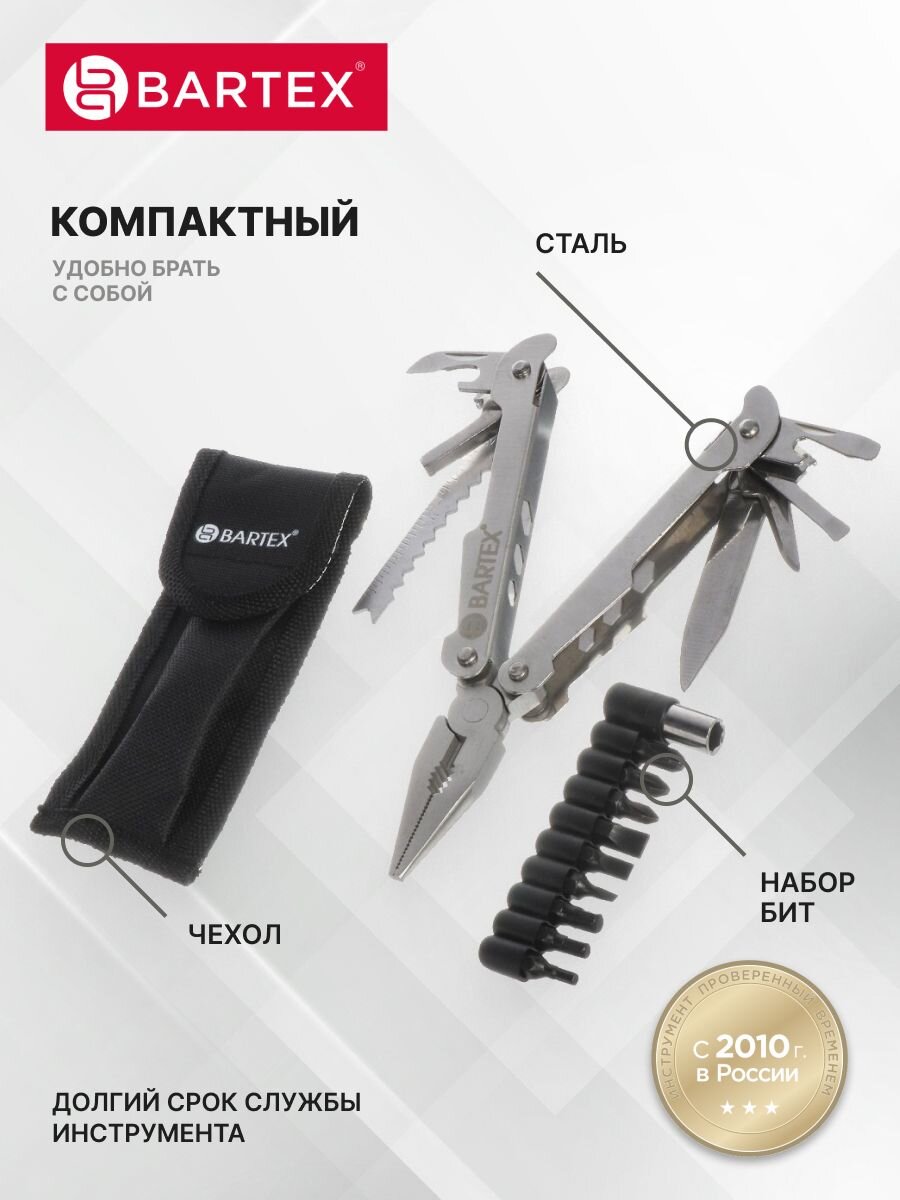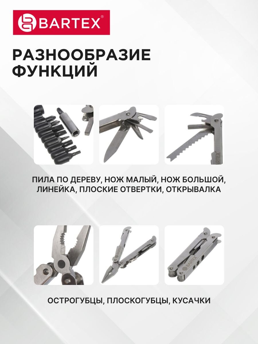 Мультитул Bartex выручит Вас в походе, на даче, в поездке, на охоте или рыбалке. Это невероятно удобно, когда Вы находитесь вдали от своей домашней мастерской, но все равно имеете доступ к самым необходимым инструментам. Если Вам требуется несложный ремонт здесь и сейчас, мультитул Bartex – лучшее решение.
