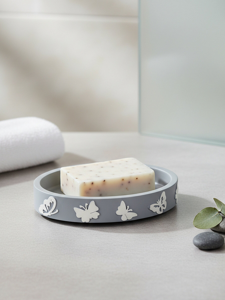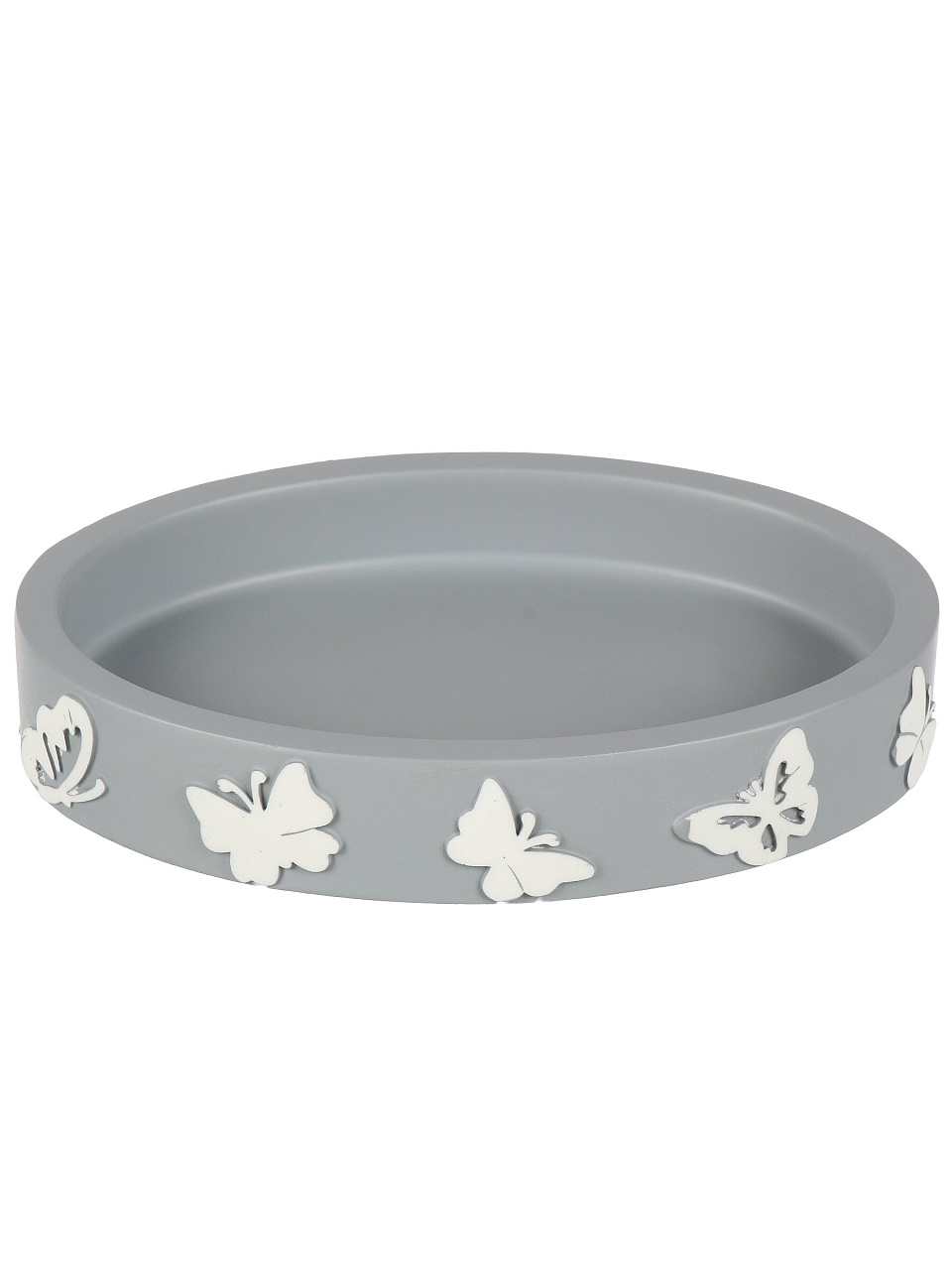 Мыльница настольная «Бабочки на сером» — стиль и практичность для ванной: долговечный полистоун, компактный размер, идеальный подарок для дома и дачи.
