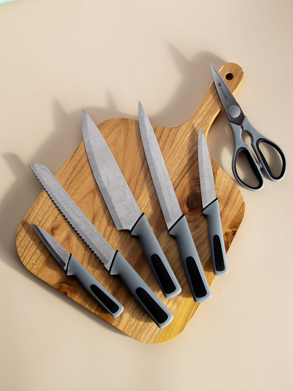 Набор ножей 7 предметов Daniks Aura — стильное и функциональное решение для современной кухни. Серый цвет и лаконичный дизайн гармонично впишутся в любой интерьер, а качественная нержавеющая сталь лезвий обеспечит долгий срок службы и безупречную остроту. В комплекте представлены шеф-нож, нож для овощей, универсальный нож, хлебный нож, разделочный нож и ножницы, что позволит легко справиться с любыми кулинарными задачами. Все предметы удобно размещаются на пластиковой подставке, которая экономит место на рабочей поверхности и поддерживает порядок на кухне.