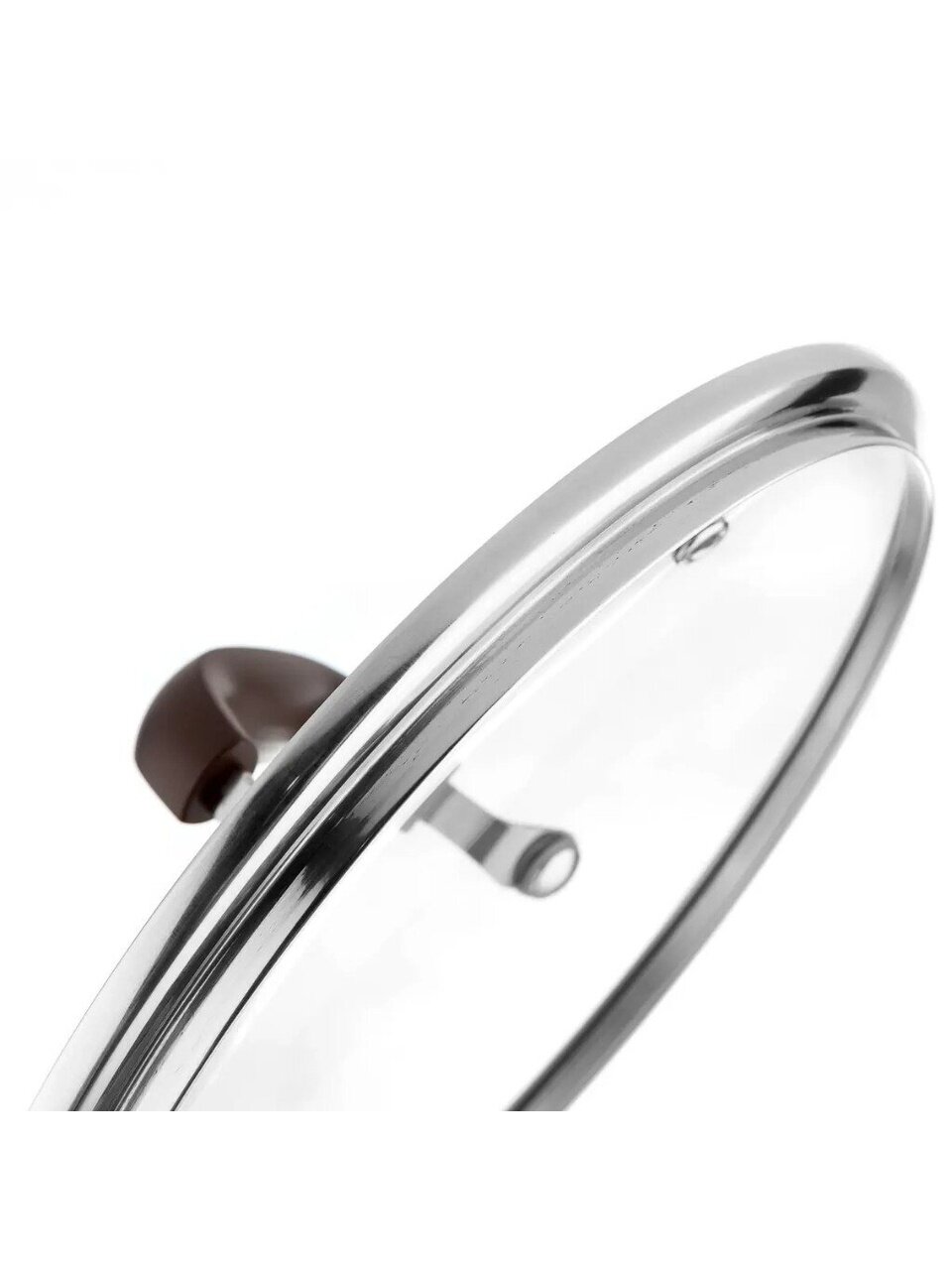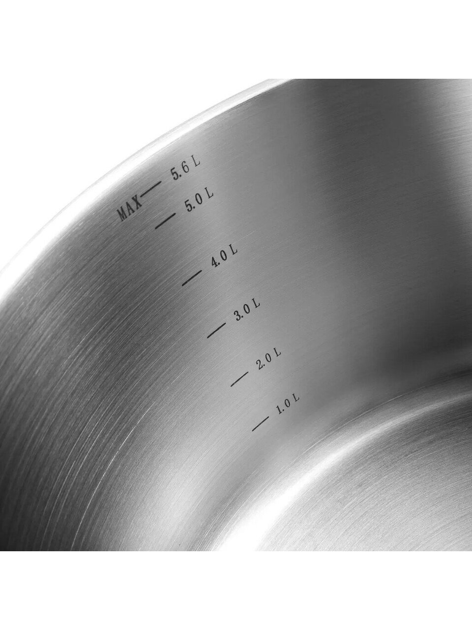 В комплекте 6 предметов: две кастрюли (3.7 и 6.3 литра), ковш 2 литра и три стеклянные крышки. Все элементы изготовлены из высокопрочной нержавеющей стали, крышки — из термостойкого стекла.