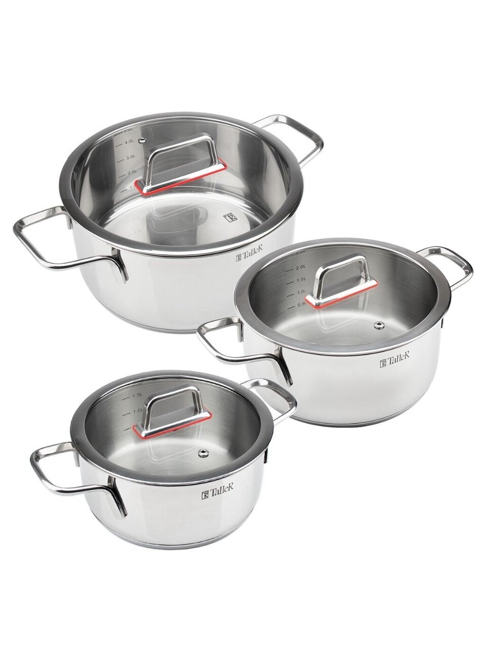 В комплекте три кастрюли объемом 2, 3 и 5 литров, изготовленные из премиальной нержавеющей стали с прочными стеклянными крышками.