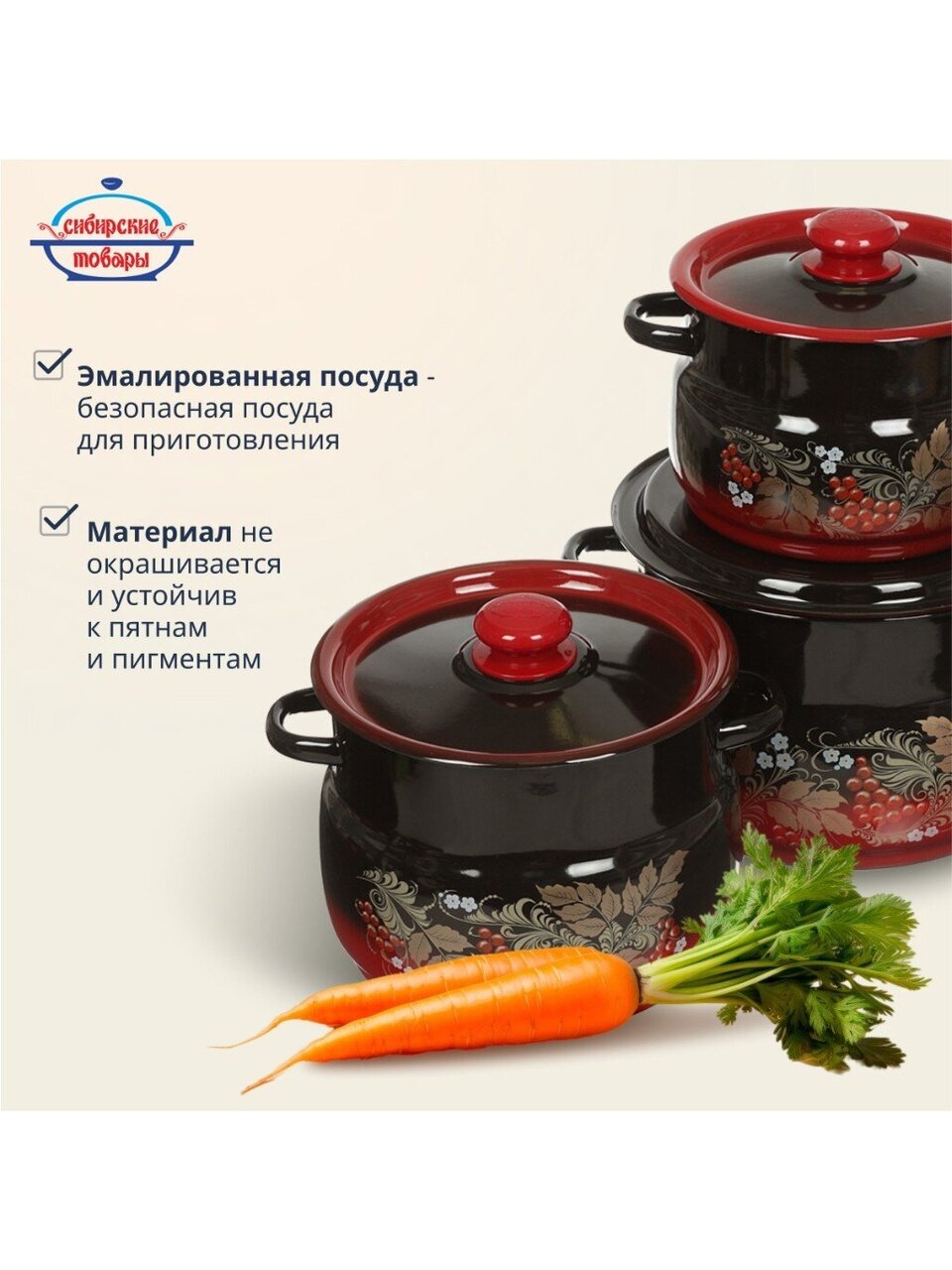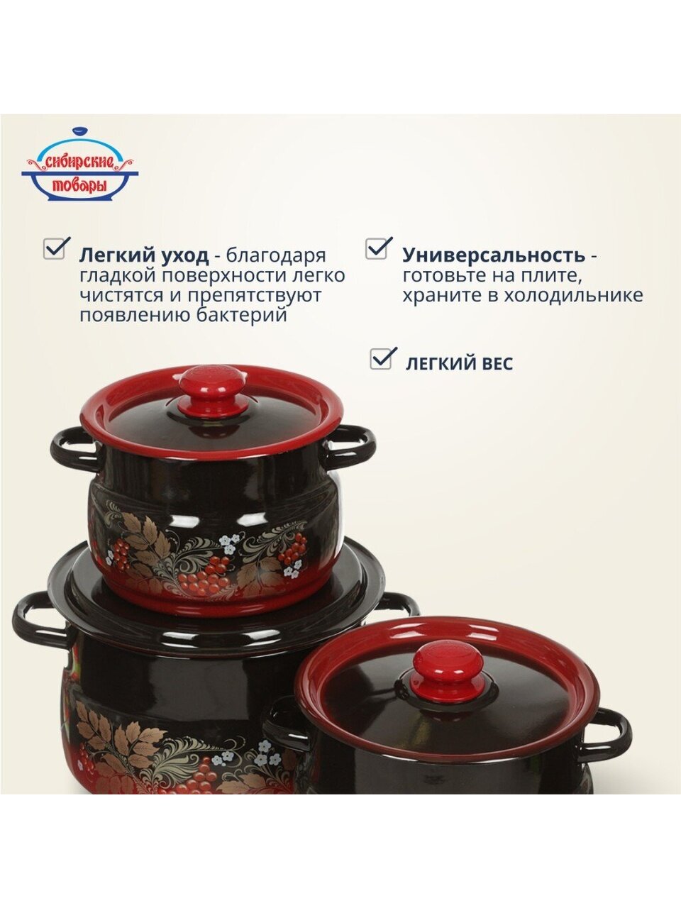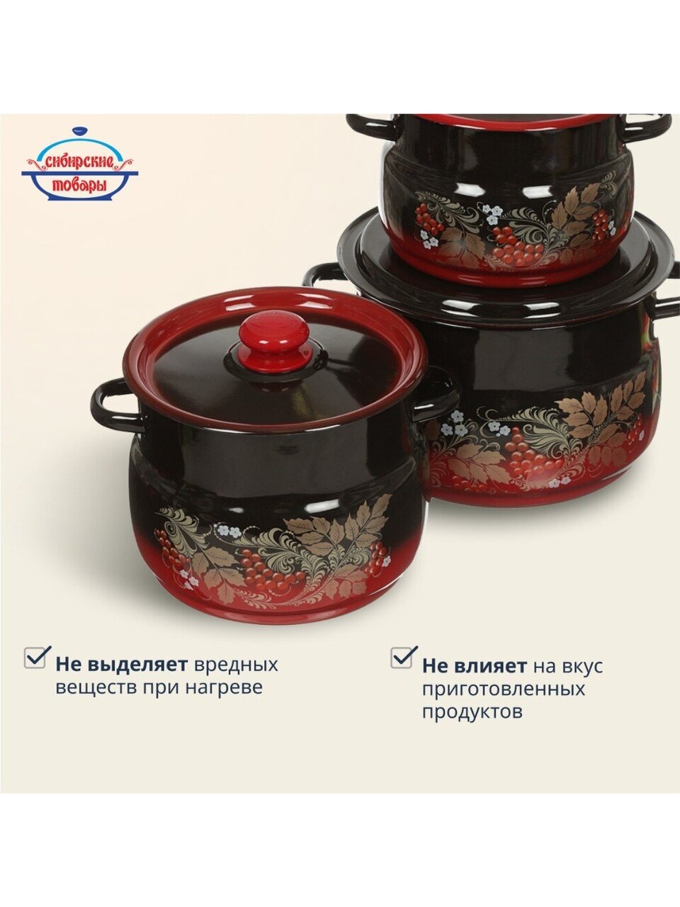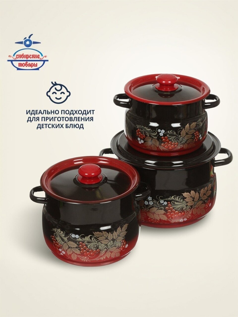 Набор кастрюль «Сибирские товары Рябинка 11» — оптимальный выбор для тех, кто ищет, какую посуду купить недорого для дачи или дома. Эмалированная сталь гарантирует долговечность, устойчивость к царапинам и простоту ухода. Благодаря трём объёмам легко подобрать нужную кастрюлю для борща, варенья или компота. Если вы спрашиваете, чем отличается эмалированная посуда от алюминиевой — эмаль не вступает в реакцию с продуктами, не влияет на вкус и сохраняет цвет блюд. Для тех, кто ищет, как выбрать набор кастрюль для семьи, этот комплект отвечает всем требованиям: безопасно, удобно, экономично.