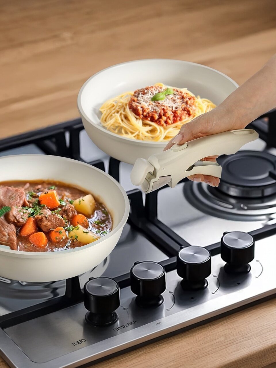 Набор включает в себя разнообразные предметы, чтобы удовлетворить все кулинарные потребности: три сковороды разных размеров, две кастрюли объемом 2 и 3 литра, а также две съемные ручки и две крышки с силиконовым ободом. Крышки из стекла позволяют контролировать процесс приготовления без необходимости их снимать, что сохраняет тепло и аромат блюд.