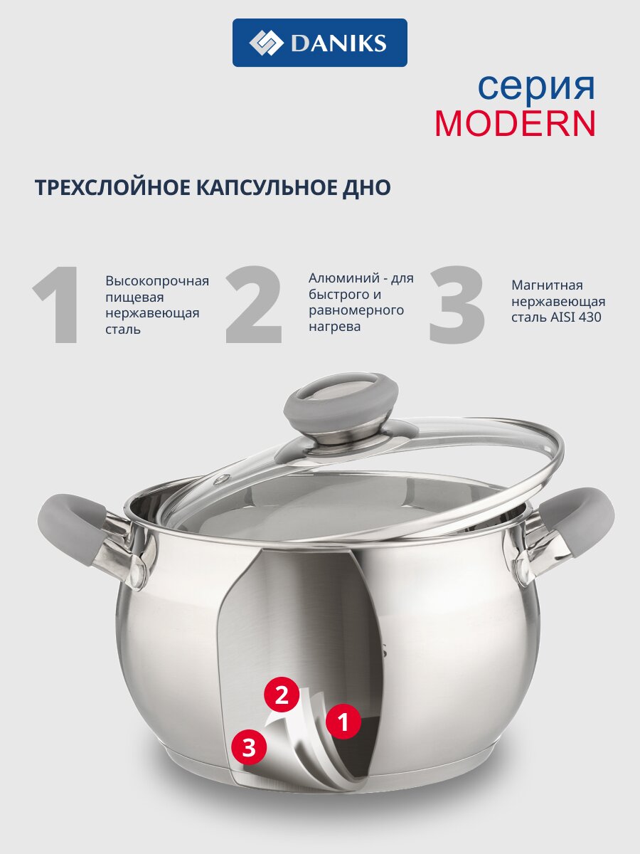Как выбрать набор посуды для индукционной плиты? Daniks Модерн серый — это продуманный комплект из 10 предметов, где каждая кастрюля и ковш выполнены из прочной нержавеющей стали. Стеклянные крышки позволяют наблюдать за процессом готовки, а эргономичные ручки обеспечивают комфортное использование. Благодаря отсутствию антипригарного покрытия, посуда подходит для любителей классической кулинарии и легко очищается даже после активной эксплуатации.