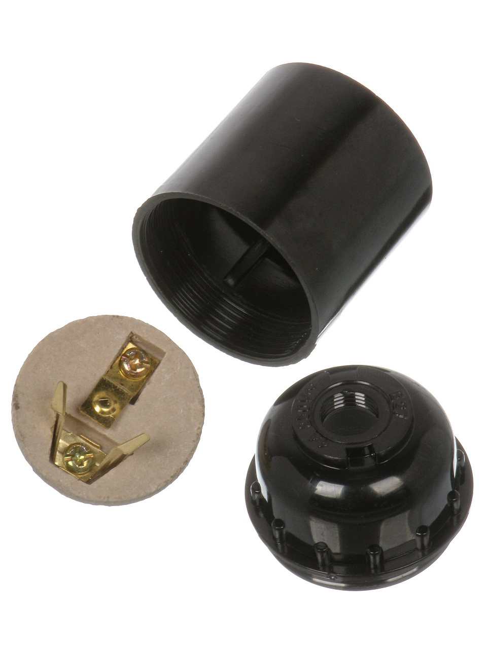 Стандартный цоколь E27, подвесная резьба М10, ток до 4А, напряжение до 250В, материал — карболит, индивидуальная упаковка.