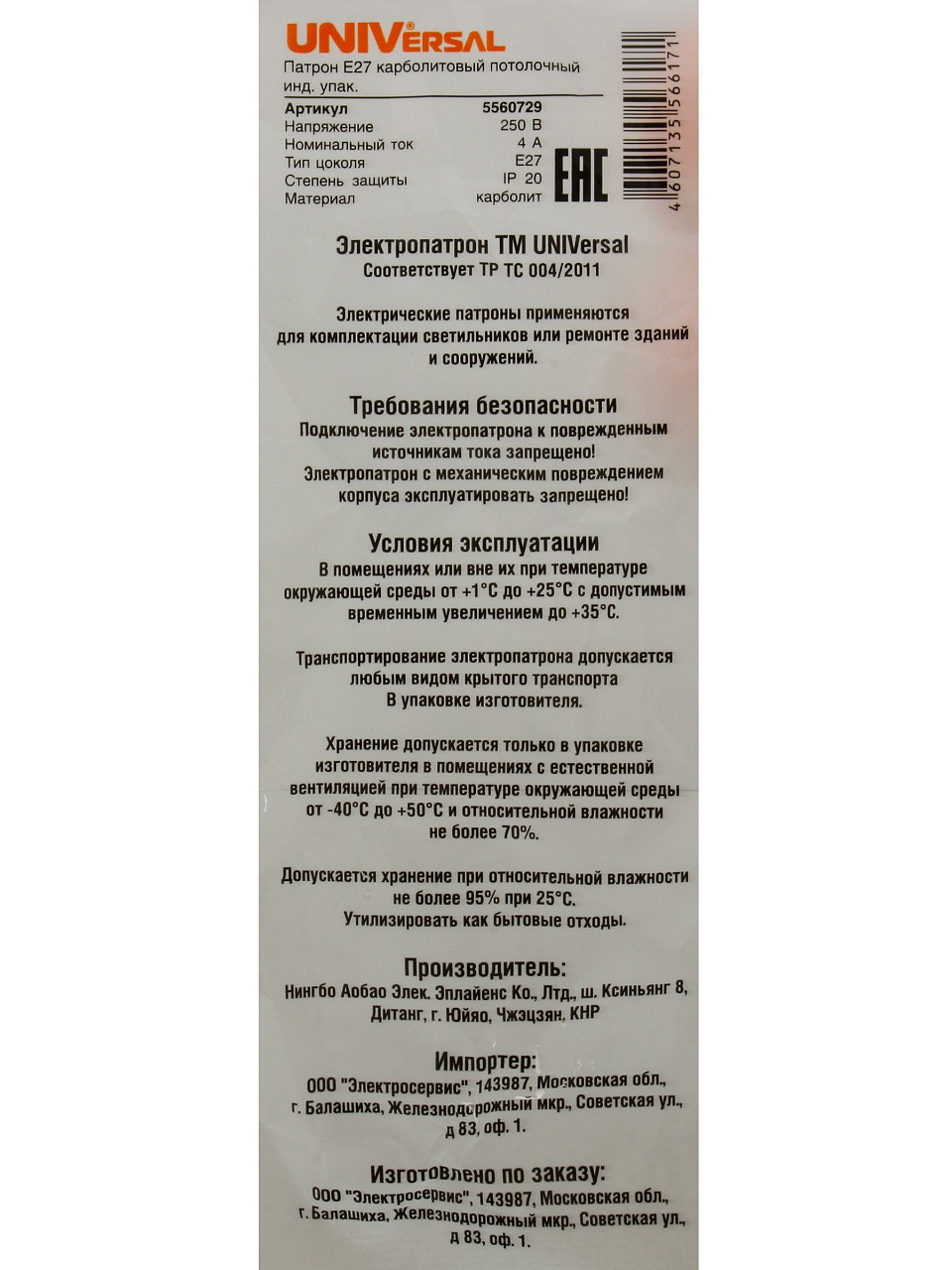 Патрон UNIVersal подходит для всех стандартных ламп с цоколем Е27, выдерживает ток до 4А и напряжение 250В, выполнен из термостойкого карболита.