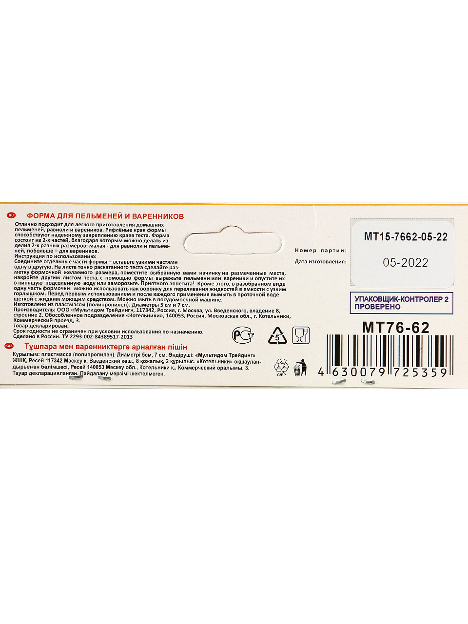 В комплекте 2 формы: диаметр 4,5 см и 7 см. Это оптимальные размеры для стандартных домашних пельменей и вареников, подходят для разных видов теста и начинок.
