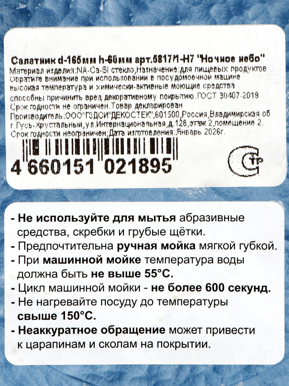 Если вы спрашиваете, подходит ли салатник для подарка, обратите внимание: он универсален, а его доступная цена позволит купить недорого салатник для дачи или в качестве небольшого презента. Стекло не содержит вредных примесей, а стильное оформление «Ночное небо» понравится любителям минимализма и современных решений.