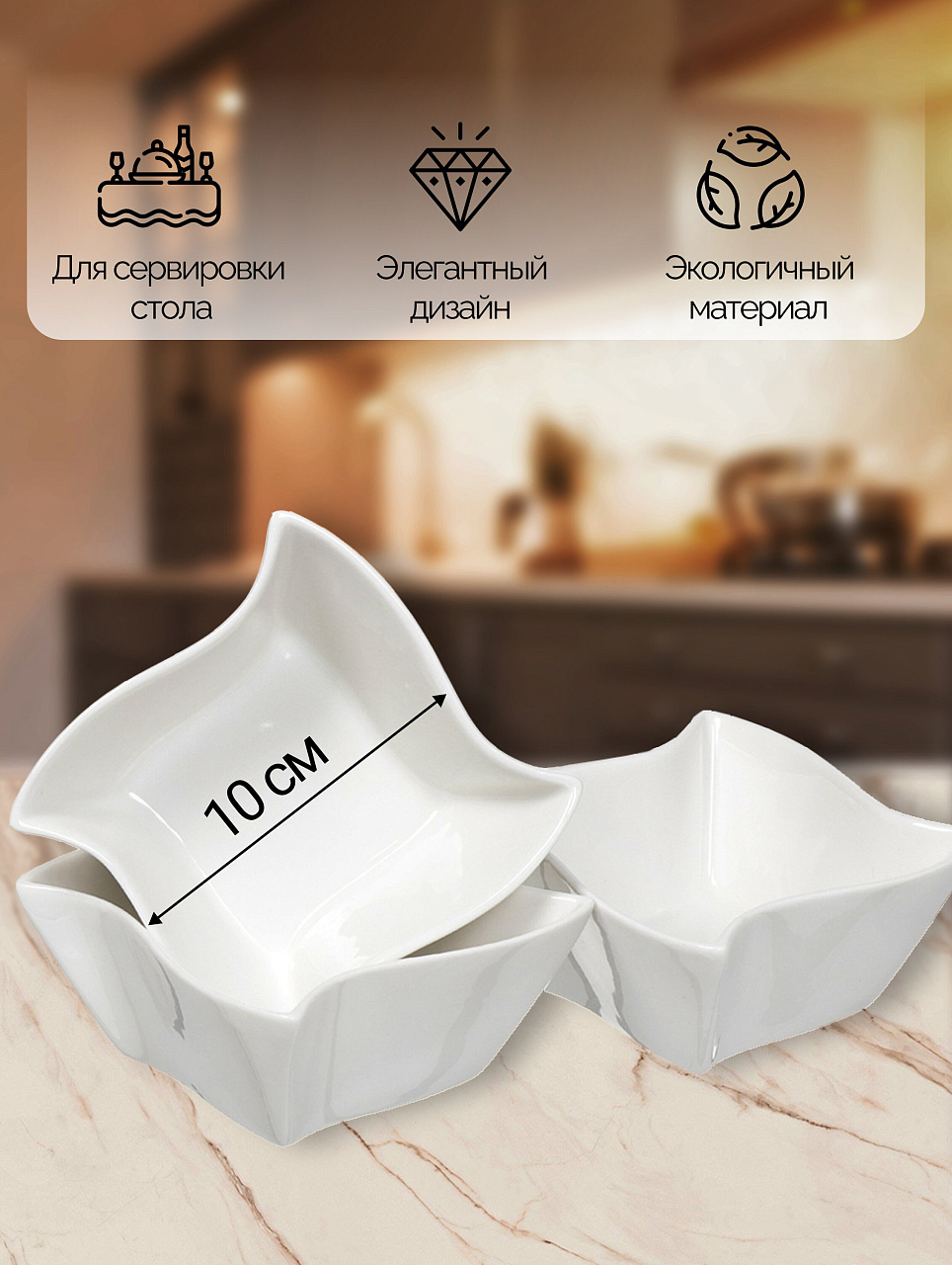 Салатники керамические квадратные 10х5 см, набор 3 шт. — идеальное решение для сервировки, хранения и подачи закусок дома и на даче. Прочный материал, универсальный стиль.