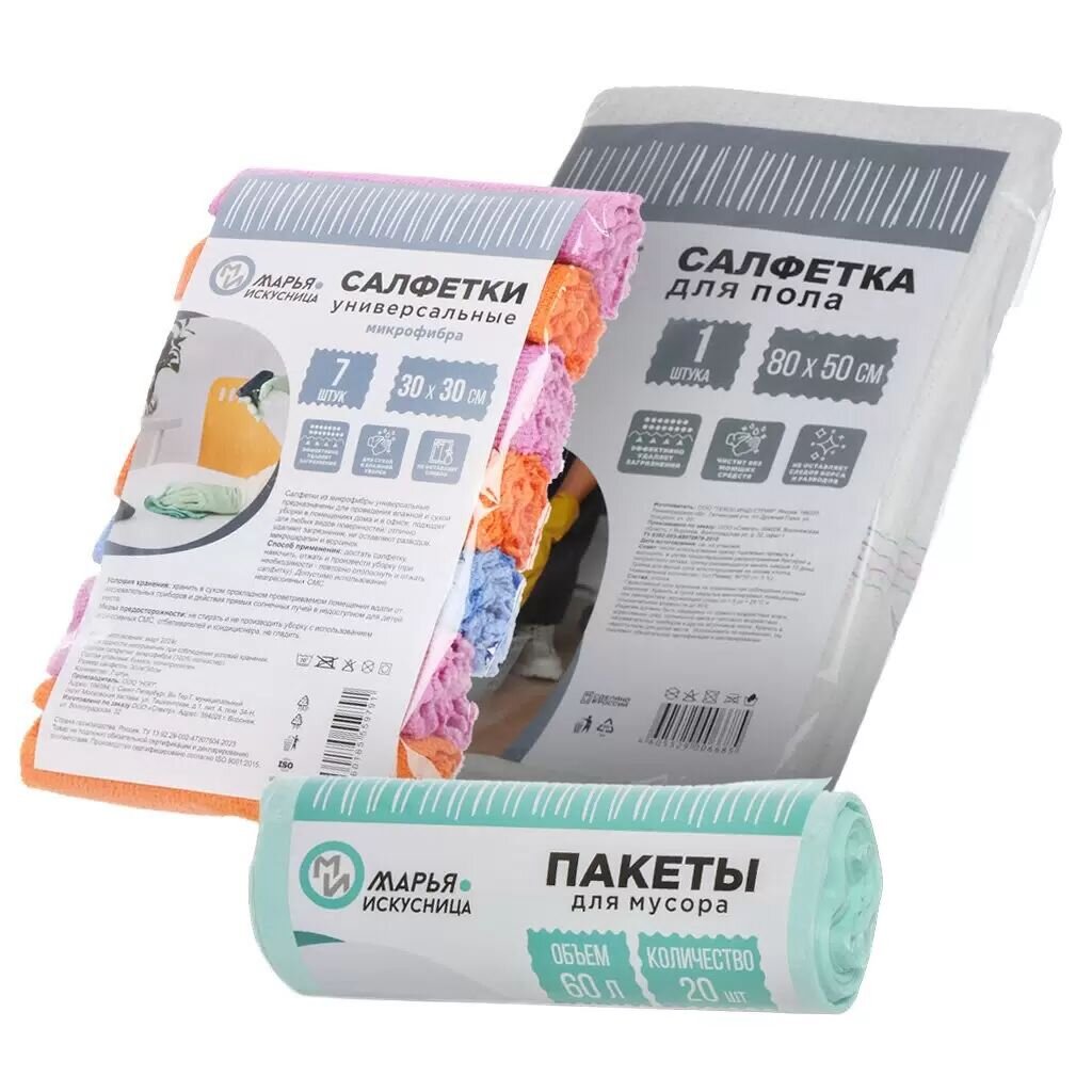 Вы можете приобрести «Набор для уборки Марья Искусница, салфетки из микрофибры 30х30 см 7 шт, пакеты 20 шт 60 л, салфетка для пола 0.5х0.8 м» и другие товары в нашем интернет-магазине в Астрахани по низким ценам и с бесплатным самовывозом.