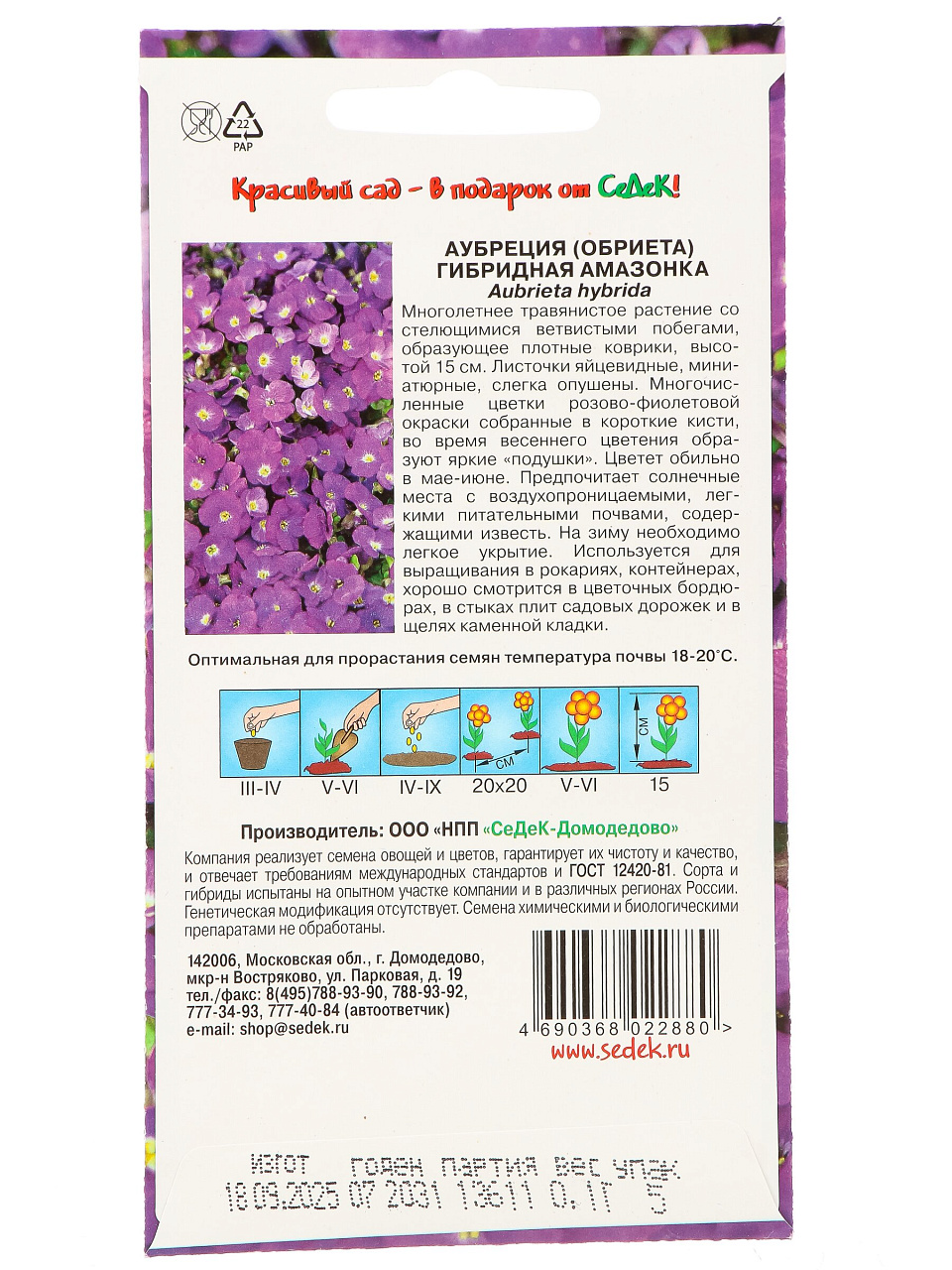 Аубреция Амазонка — компактный многолетник высотой до 15 см. Цветки розово-фиолетовые, цветение начинается на второй год после посева. Производитель — Седек, упаковка — цветная, страна продавца — Россия.