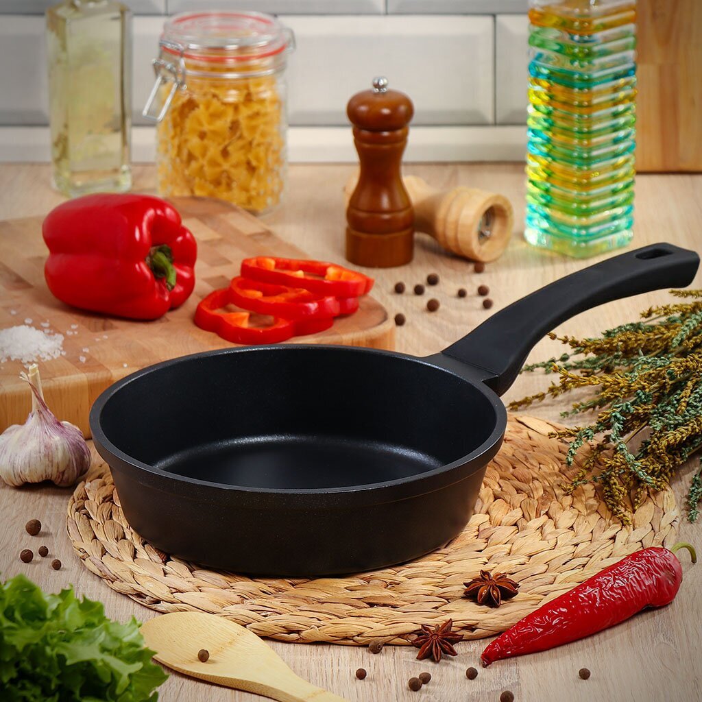 Часто спрашивают: какой сковородой лучше пользоваться для индукционной плиты? Эта модель совместима с индукцией, газом, стеклокерамикой и электричеством — универсальный вариант для любой кухни. Если сравнивать с обычными алюминиевыми сковородами, литой корпус прочнее и служит дольше, а тефлоновый слой надежно защищает от пригорания. Как выбрать размер сковороды? 20 см — оптимально для 1-2 порций, завтраков, быстрых ужинов или использования на даче.
